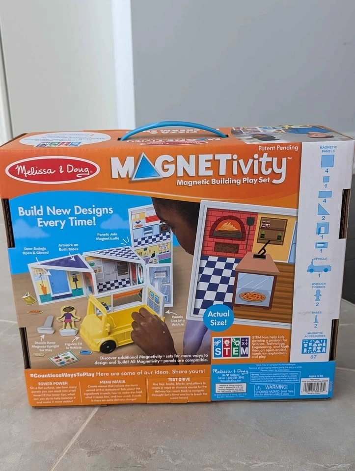 Melissa & Doug Magnetivity Magnetic Building Play Set – Pizza & Ice Cream Shop with Food Truck Vehicle (105 Pieces). Brand New, never opened. Pickup in Nobleton.