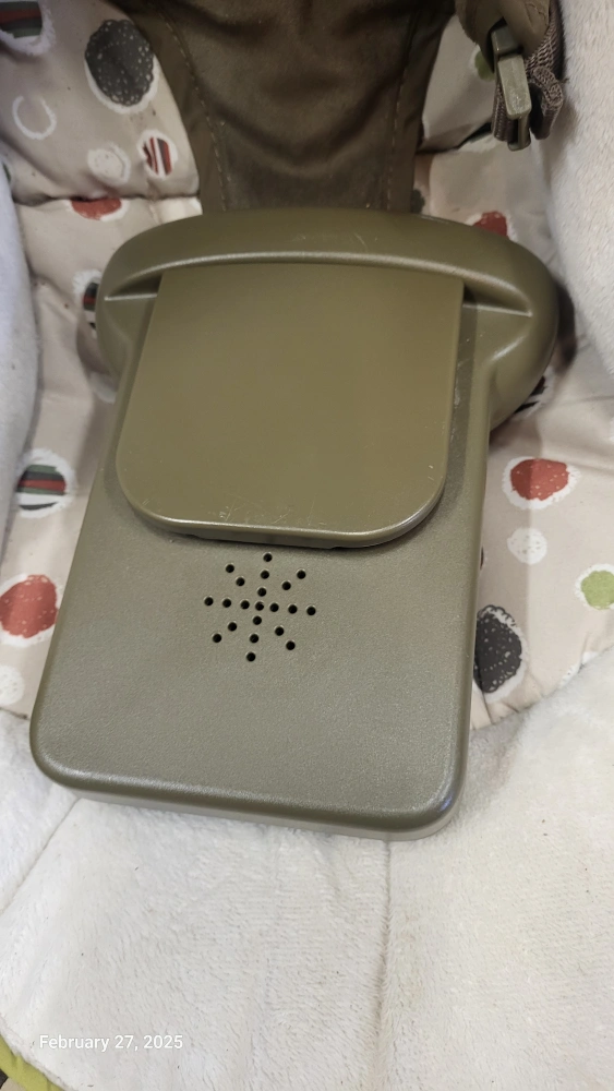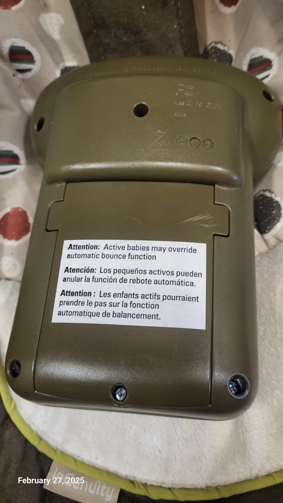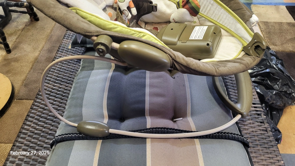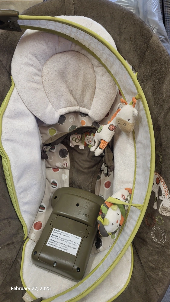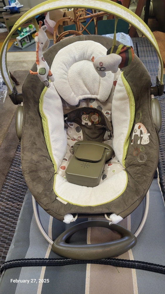 Infant baby swing, rocking chair. Features automatic bounce function. Green and beige colour scheme. Includes hanging toys. clean, excellent condition!