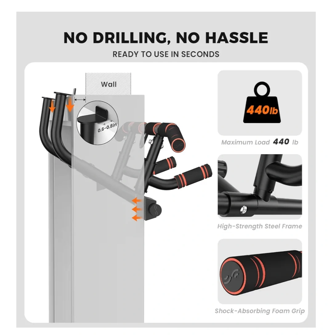 This Sportneer doorway pull-up bar features a high-strength steel frame and shock-absorbing foam grips for comfort. It has a maximum load capacity of 440 lbs and requires no drilling for setup. Multiple grip options are available for various exercises.