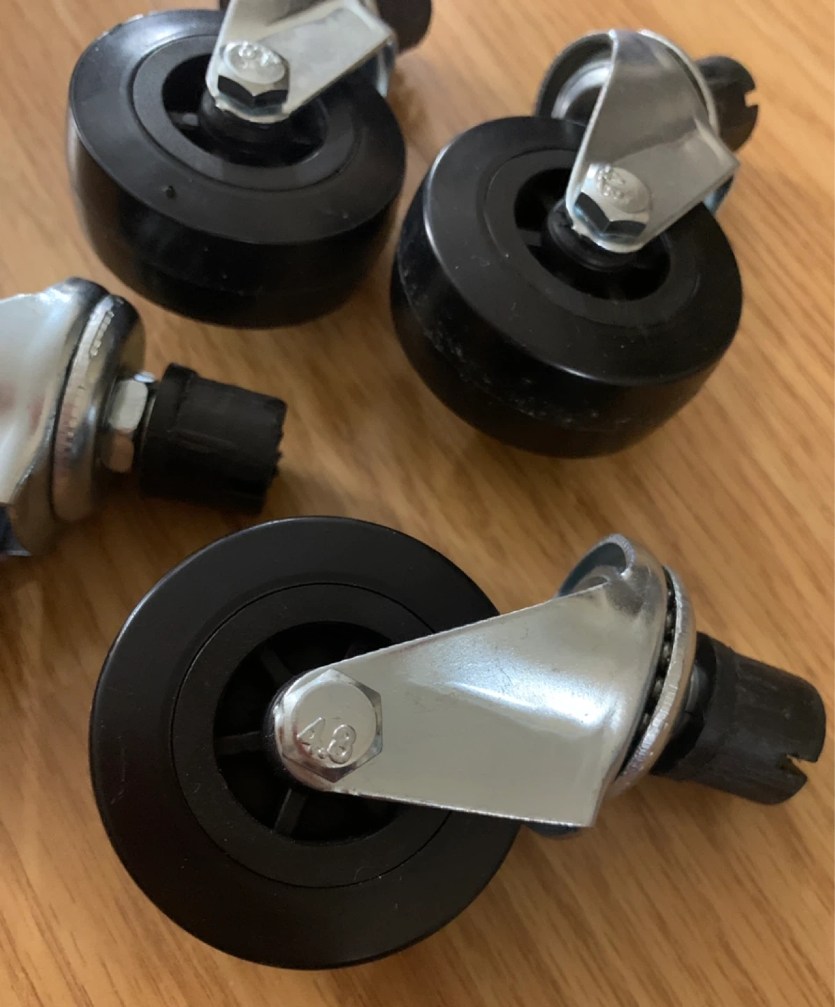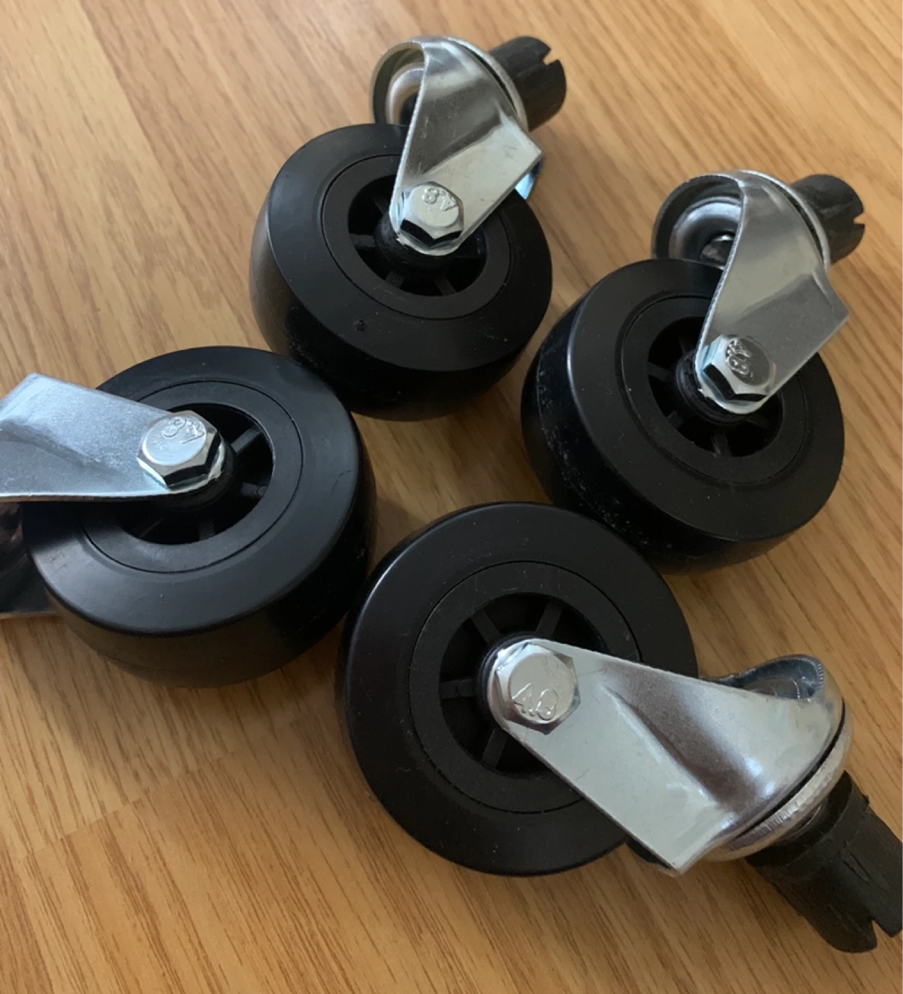 Set of four black caster wheels with metal stems. Each wheel measures approximately 3 inches in diameter. These are great for replacing worn-out casters on furniture or equipment. Installation is a simple push-in design.