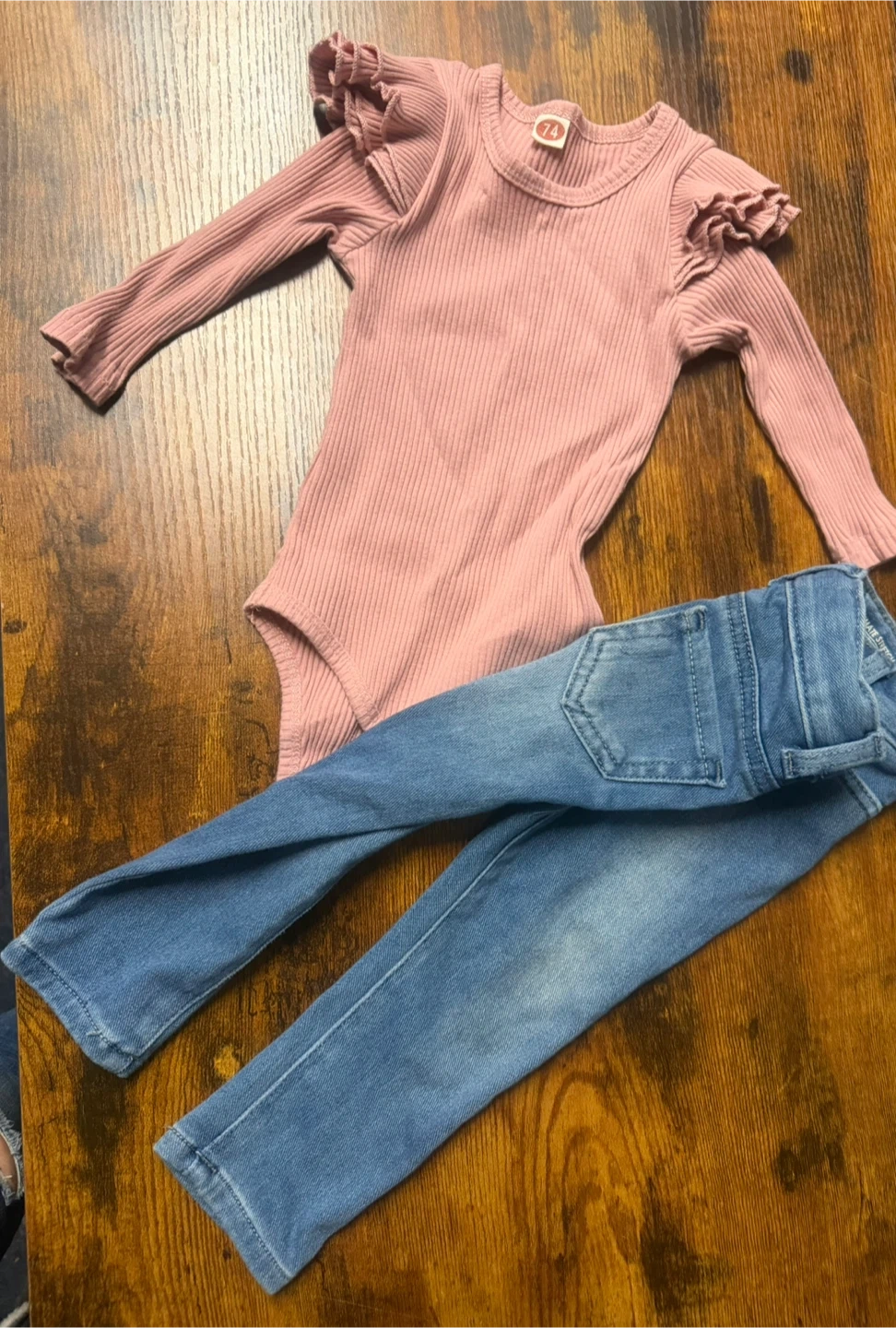 This adorable set includes a pink ribbed long-sleeve bodysuit with ruffled sleeves and a pair of blue denim jeans. It's perfect for a baby girl's everyday wear or special occasions!
