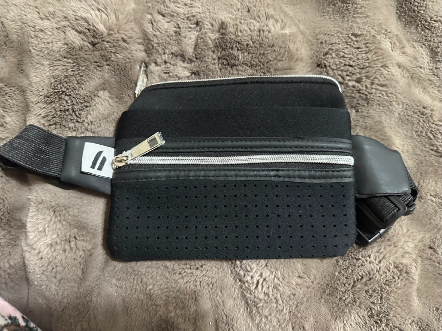 Black fanny pack with multiple zippered compartments. It features a perforated front panel and an adjustable strap. This pack is great for keeping essentials handy during activities
