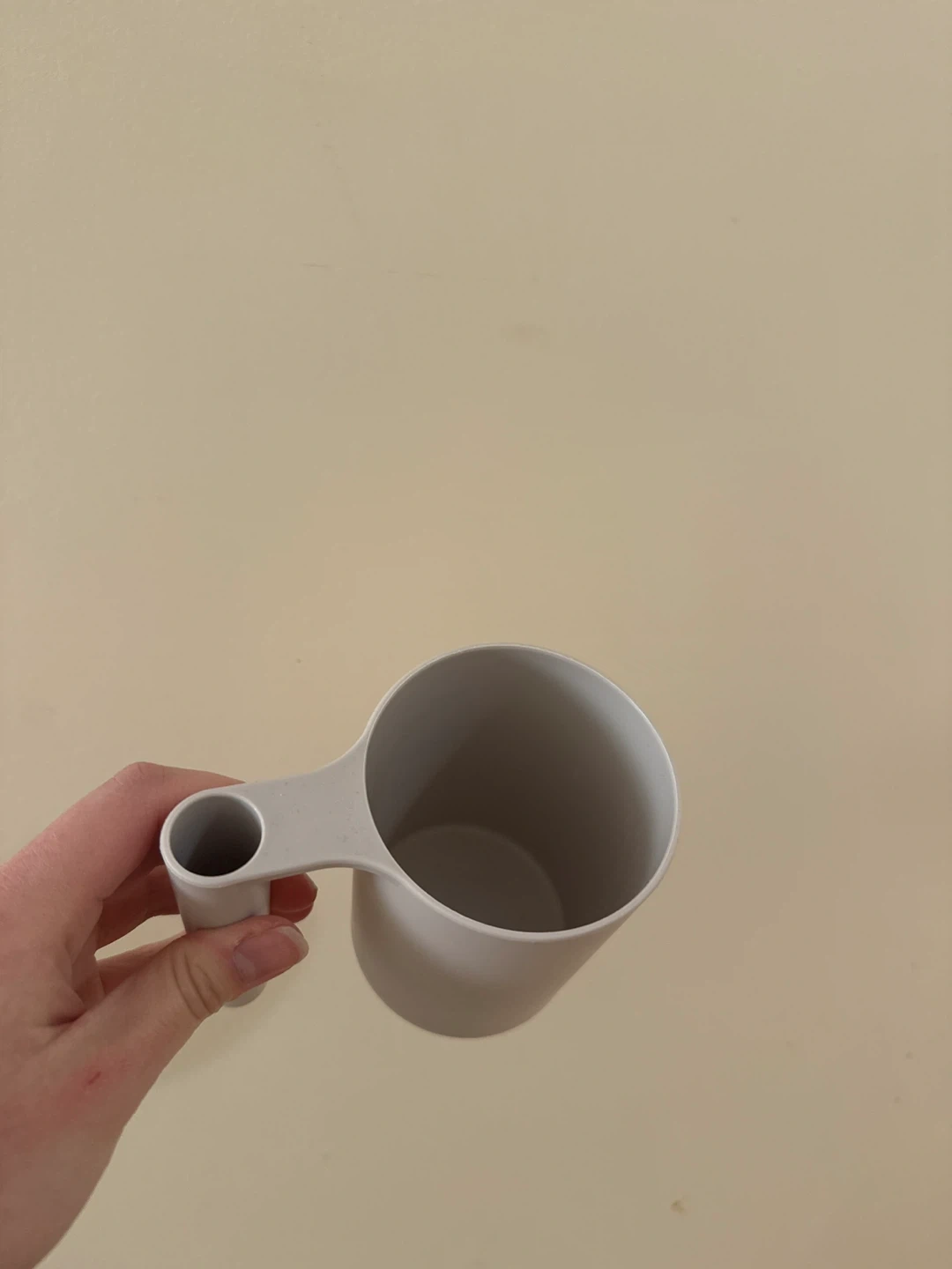 This is a simple, light grey plastic mug. It has a sturdy handle with a hole for grip. It's a great size for everyday use.
