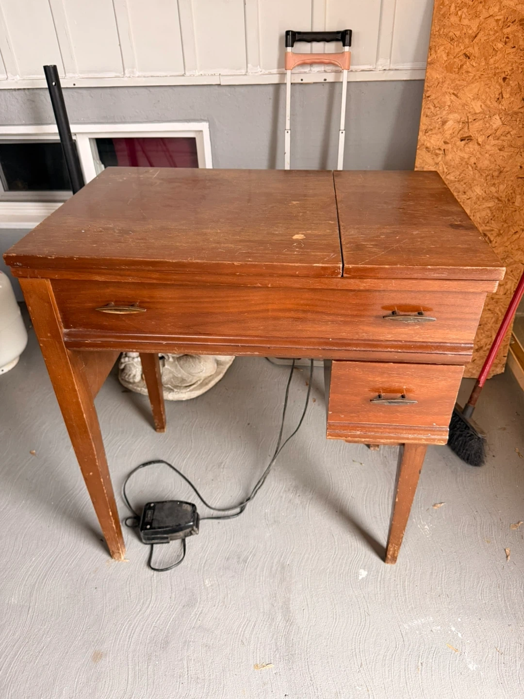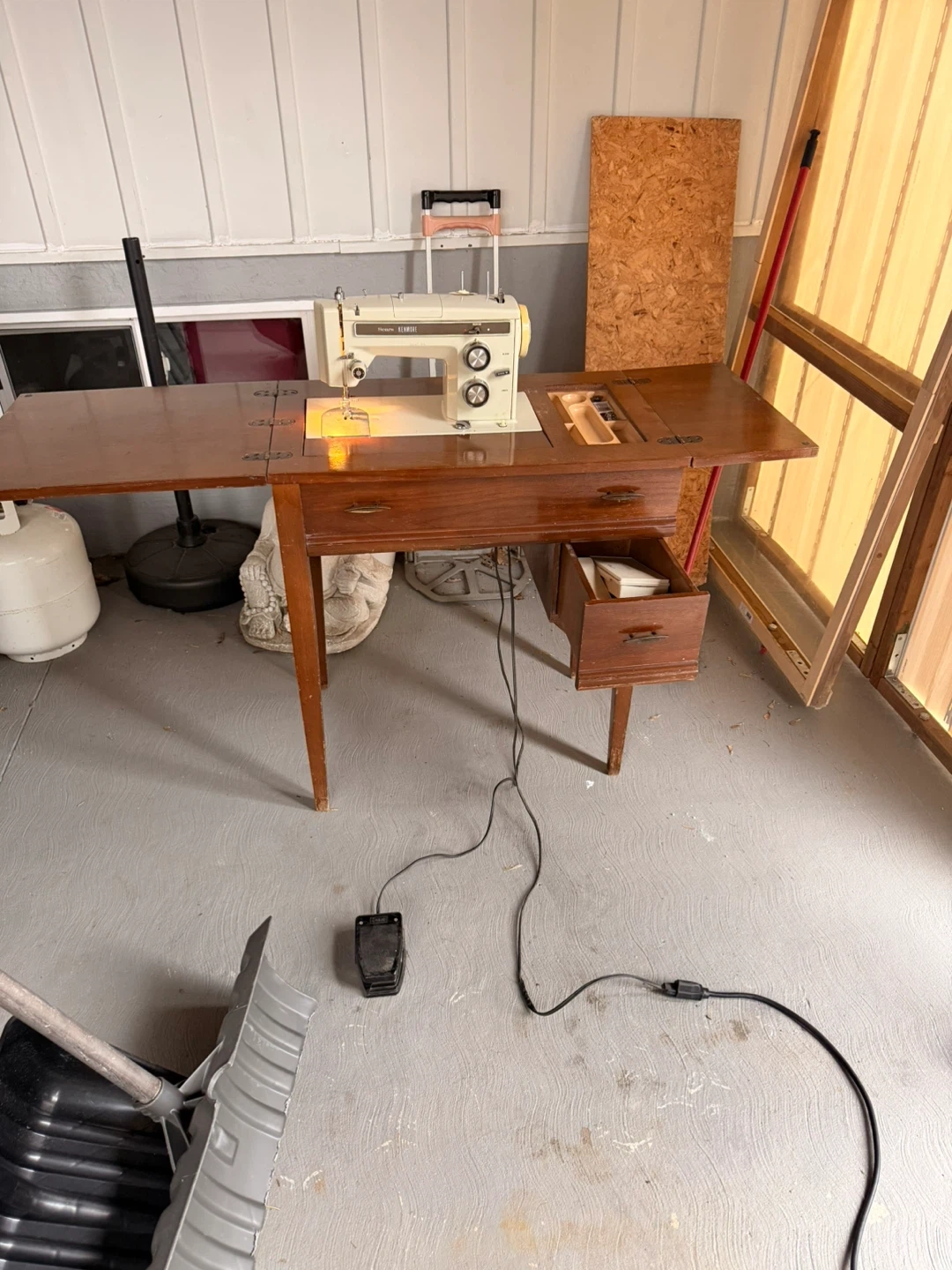 Vintage Sears Kenmore sewing machine. It's a cream-coloured model with various dials and controls. The machine sits within a wooden cabinet that has drawers for storage. Comes with a foot pedal and power cord.