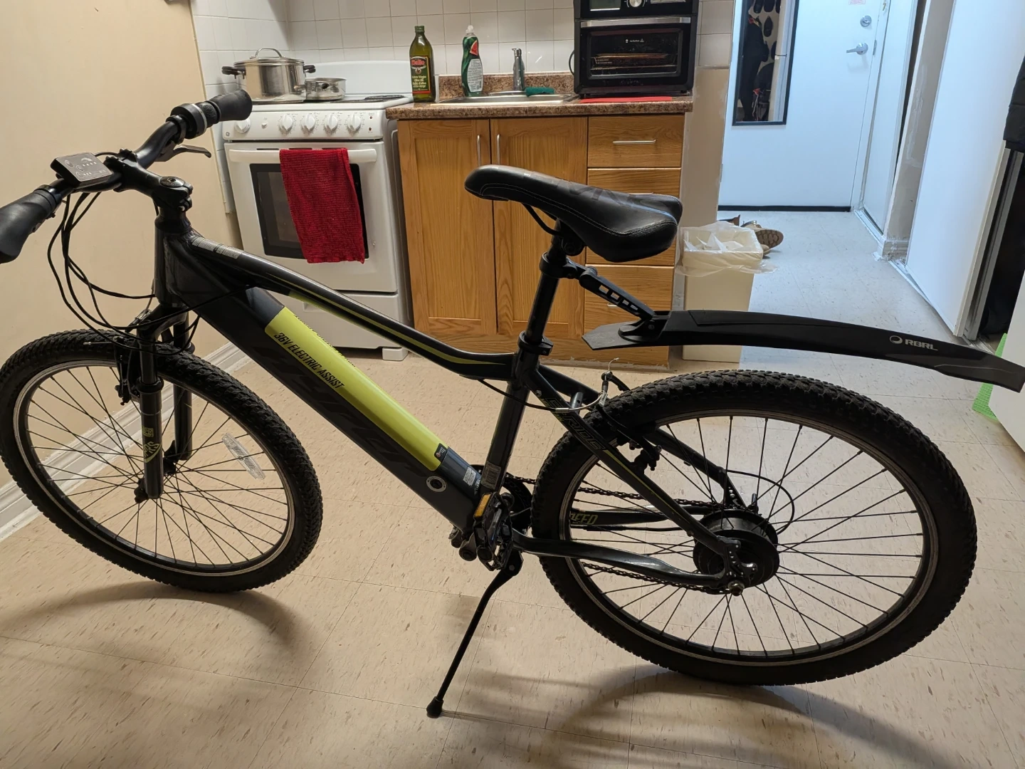 This is a black electric assist mountain bike with a 36V system. It features knobby tires suitable for trails and a front suspension fork. A rear fender is included for added protection. This bike is great for tackling varied terrain with ease!