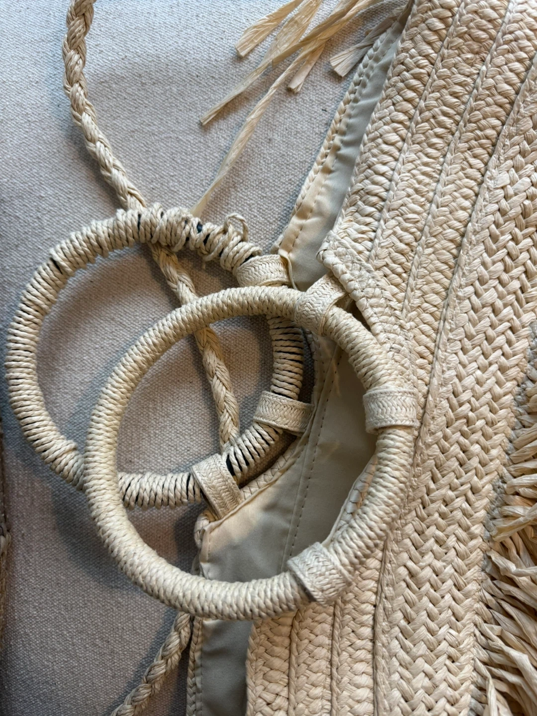 Straw tote bag featuring fun fringes and stylish round handles. It has a zippered main compartment and interior pockets for organization. Perfect for a beach day or casual outings!