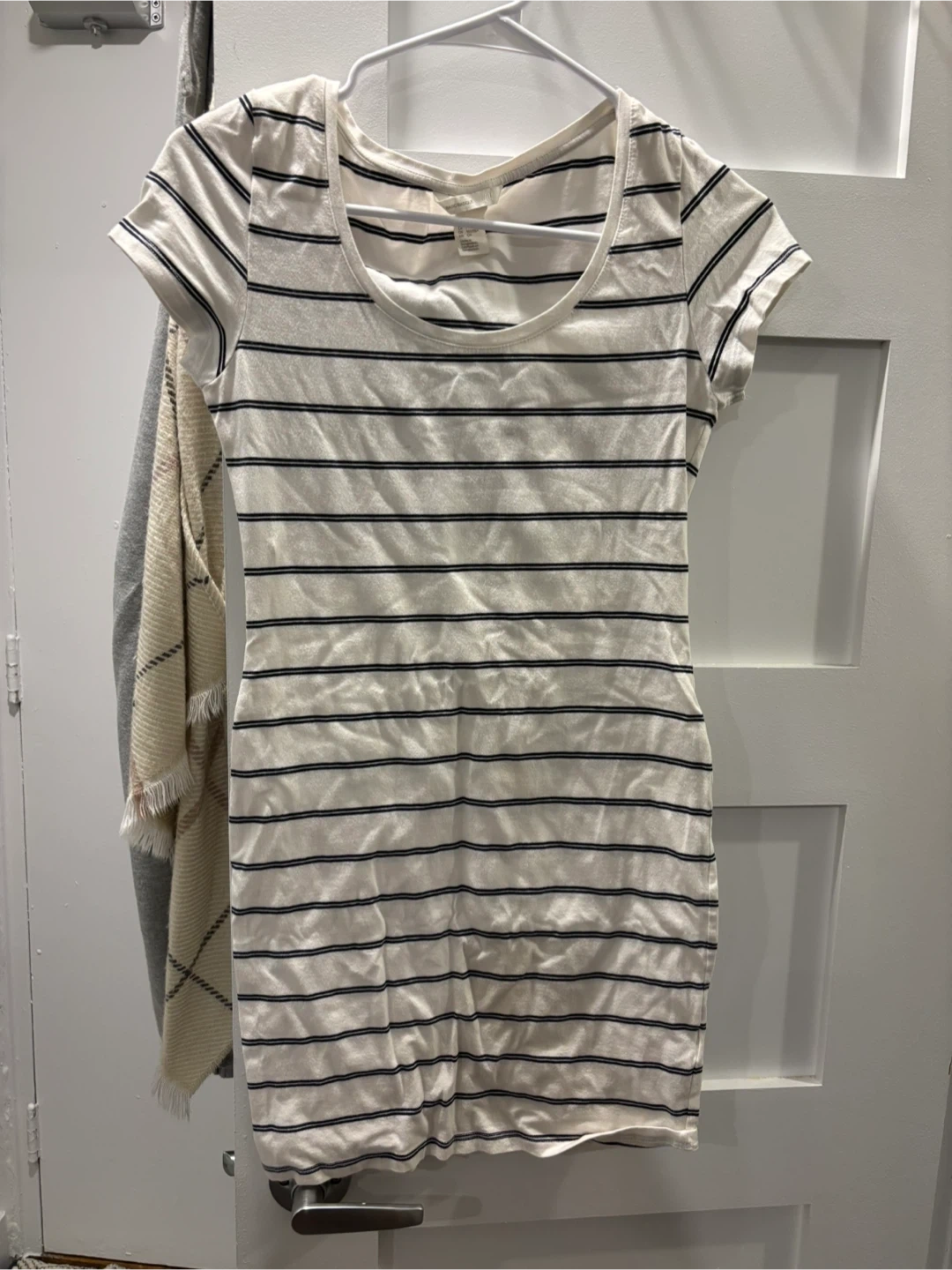 This is a simple white t-shirt dress with black horizontal stripes. It's a short-sleeved, scoop-neck style. Made from a comfortable, stretchy material.