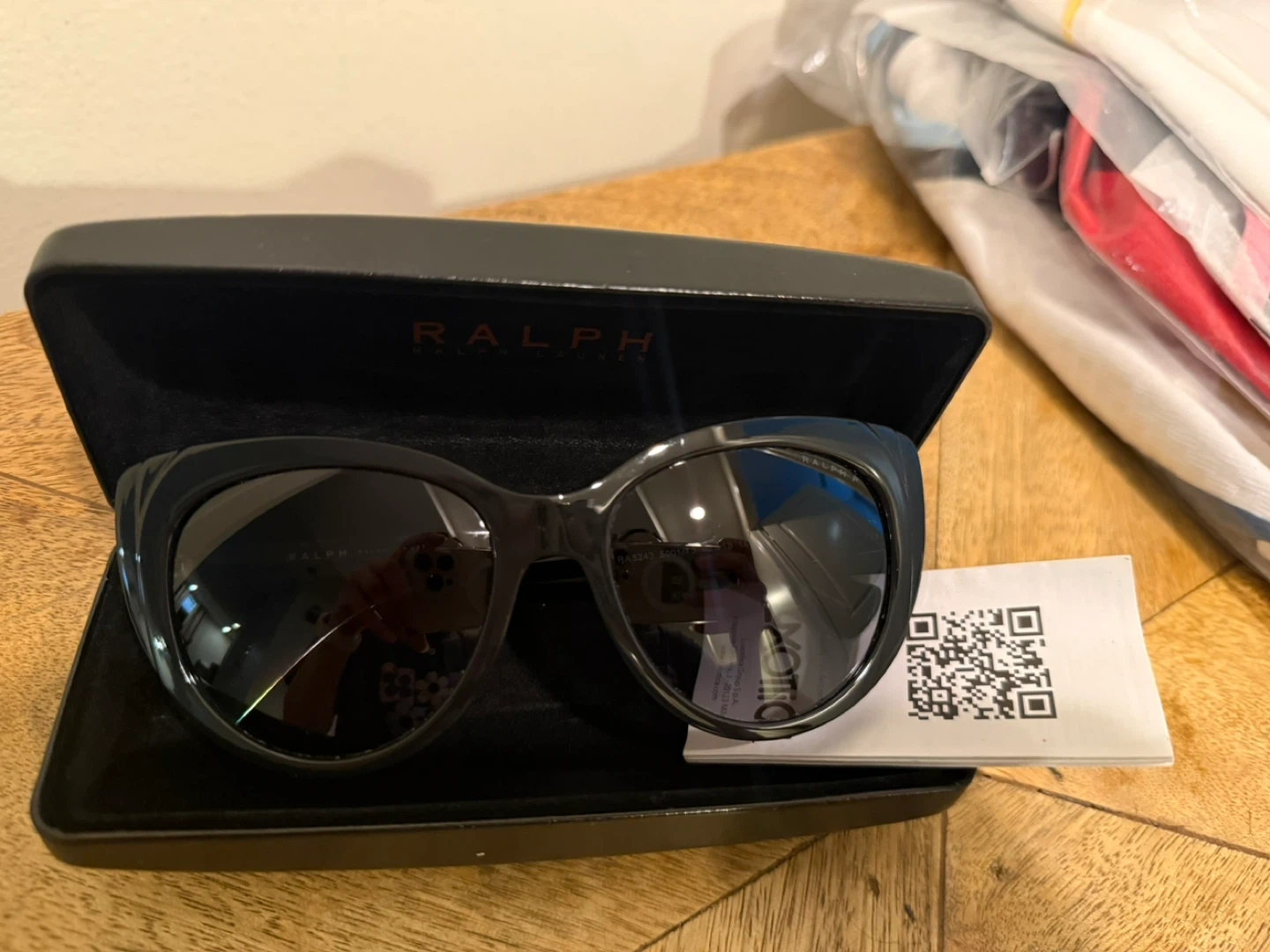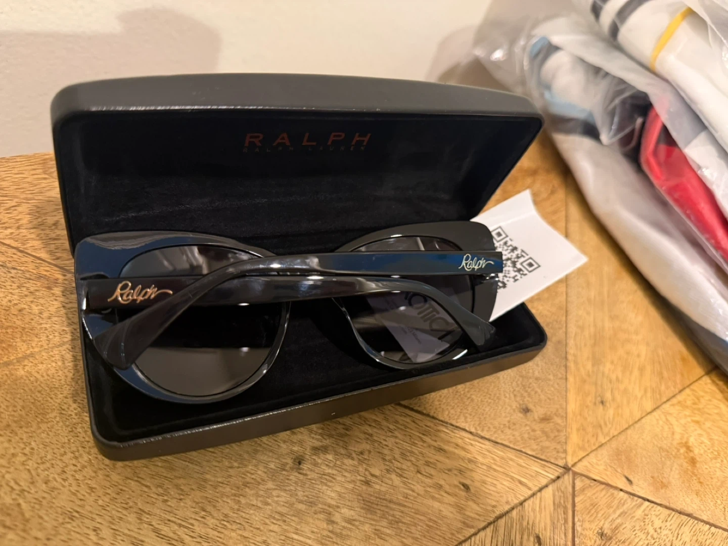 These are black cat-eye sunglasses from Ralph Lauren. They come with their original hard case. The frames are glossy black plastic and feature the Ralph Lauren logo on the temples. This style is classic and chic!