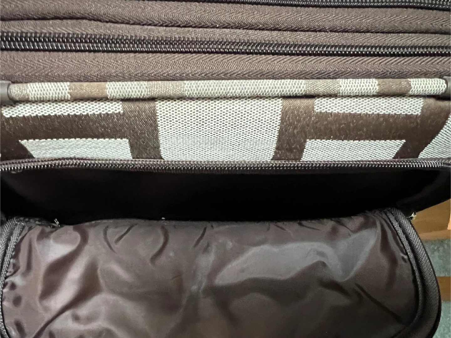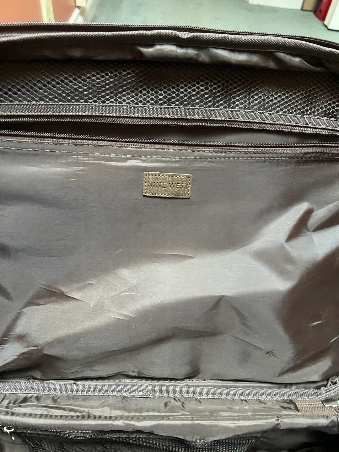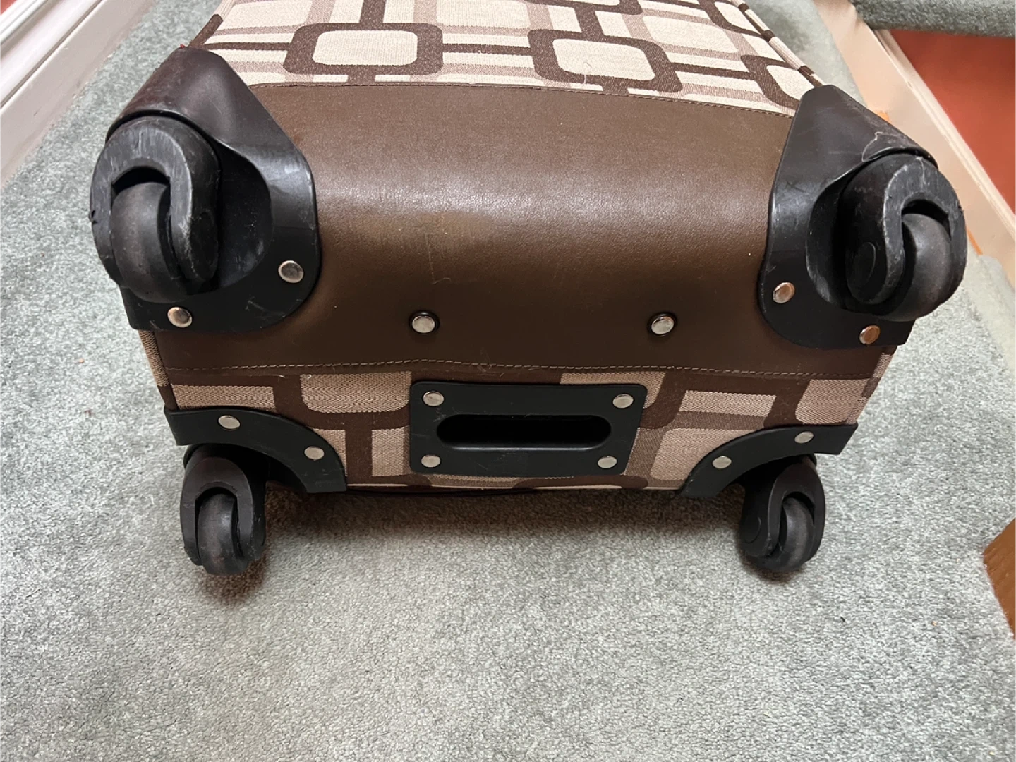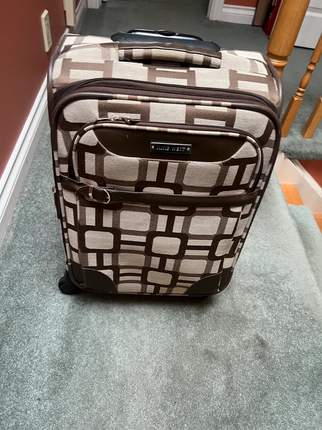 Brown and tan patterned carry-on suitcase by Nine West. It has a retractable handle and spinner wheels. Fabric material. 14 inches across in depth is anywhere from 7 to 9 inches depending on if you choose the expander or not. The suitcase was not used a lot and is an excellent condition. The side handle is something that people don’t realize what a bonus it is to have. Item comes from a pet and smoke free home. Port union/401/Pickering for pick up.