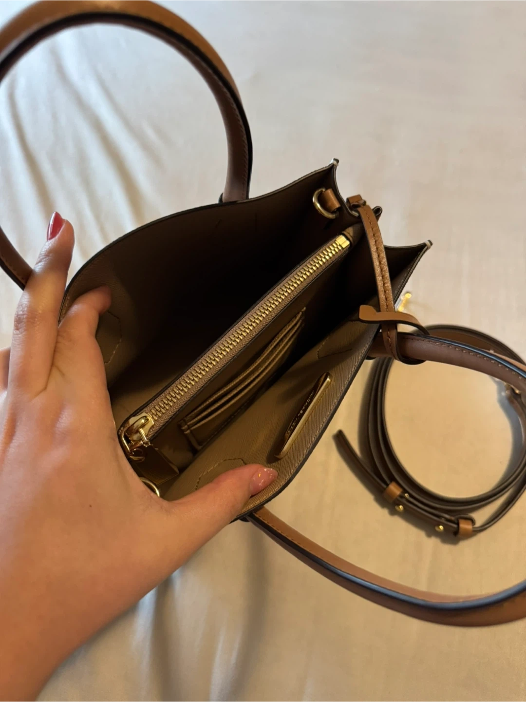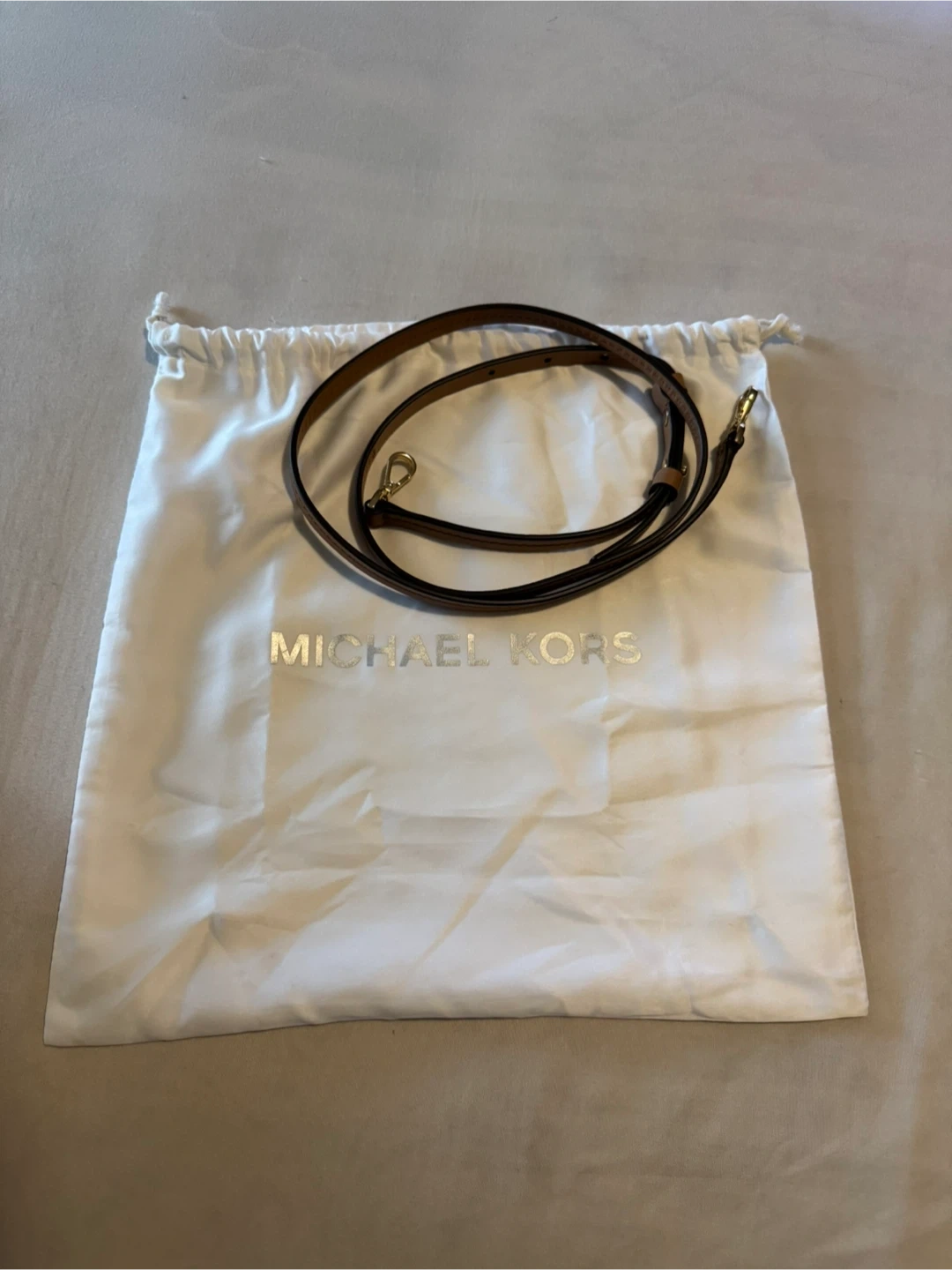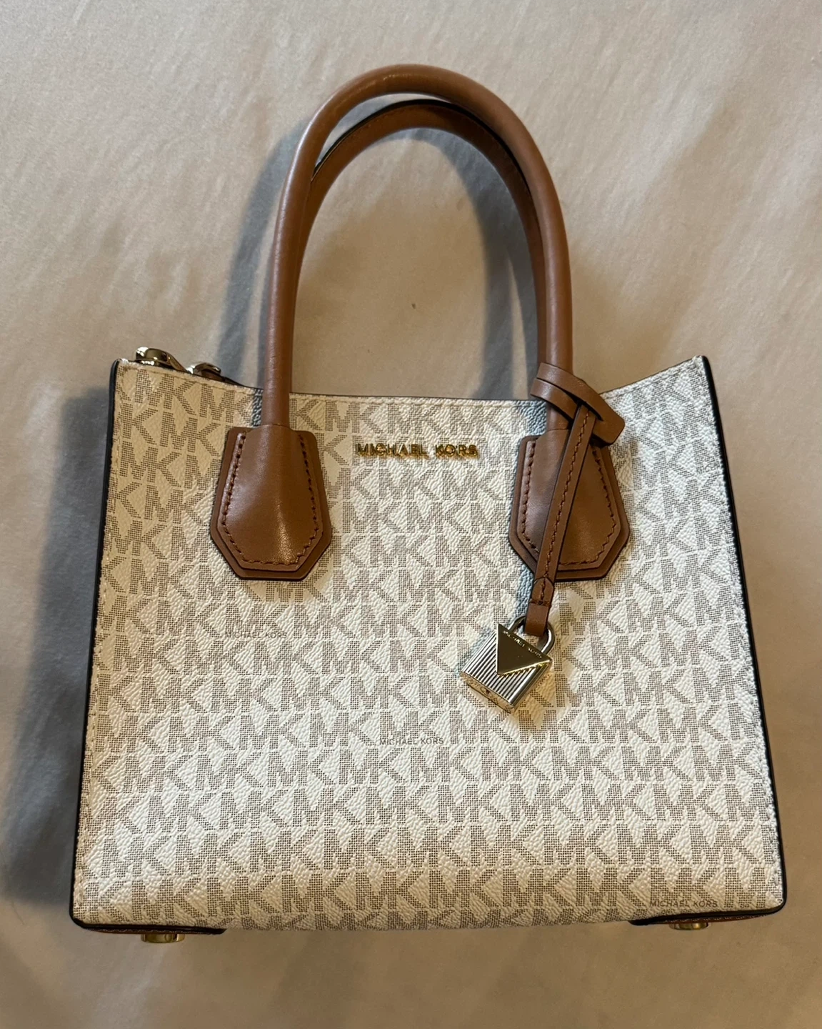Michael Kors satchel handbag with signature logo print and tan leather trim. Comes with a dust bag and adjustable shoulder strap. Interior zip pocket and card slots included.