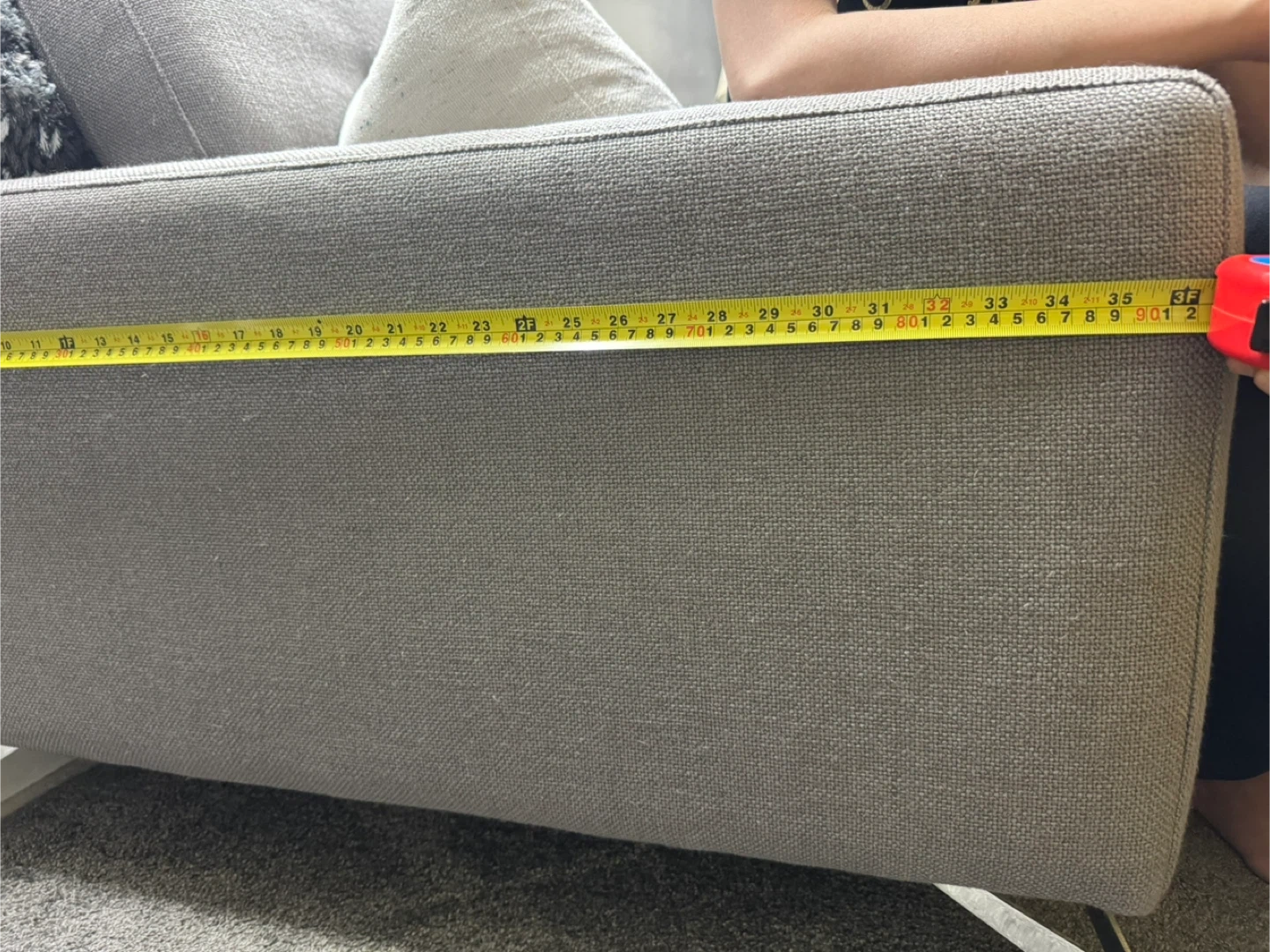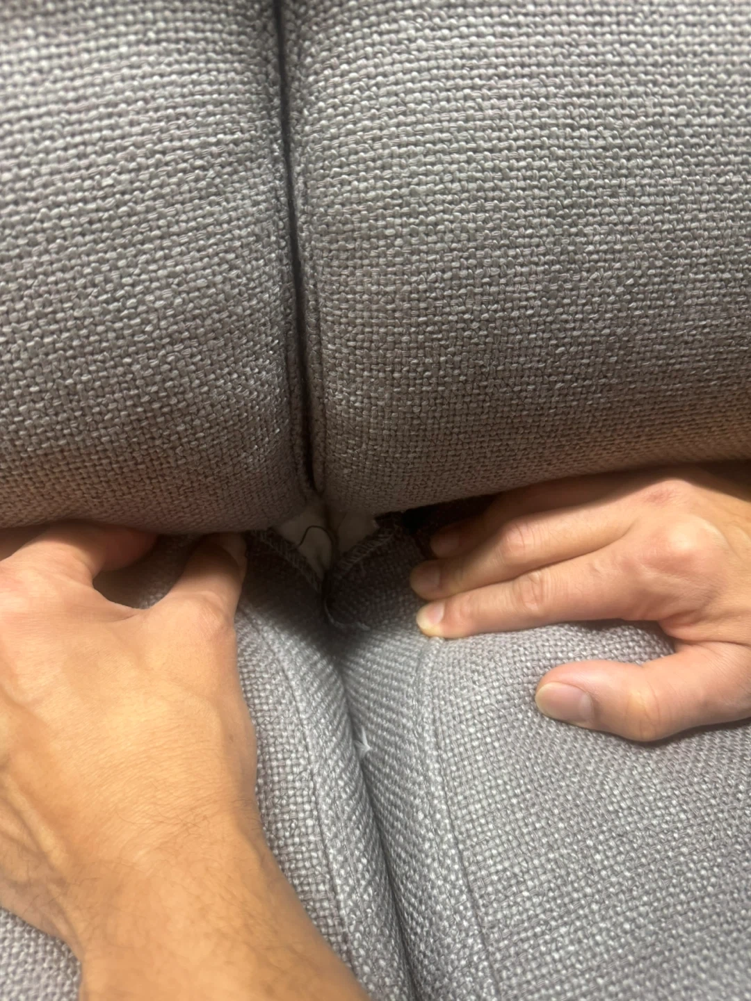 There is a small tear in the fabric between the cushions (shown in last picture). It does not affect the comfort or structure of the sofa, price reflects the condition. It's not even visible as shown in last picture.