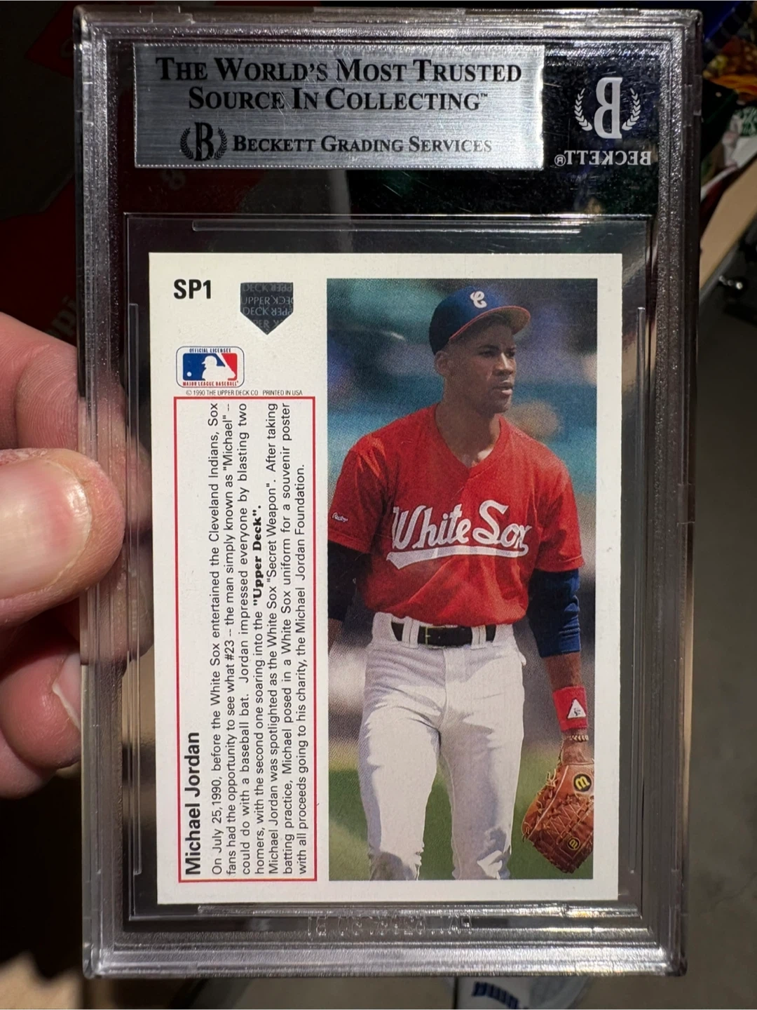 This is a 1991 Upper Deck Michael Jordan SP baseball card, professionally graded by Beckett at a Mint 9! It's a sought-after collectible for any baseball or basketball fan.