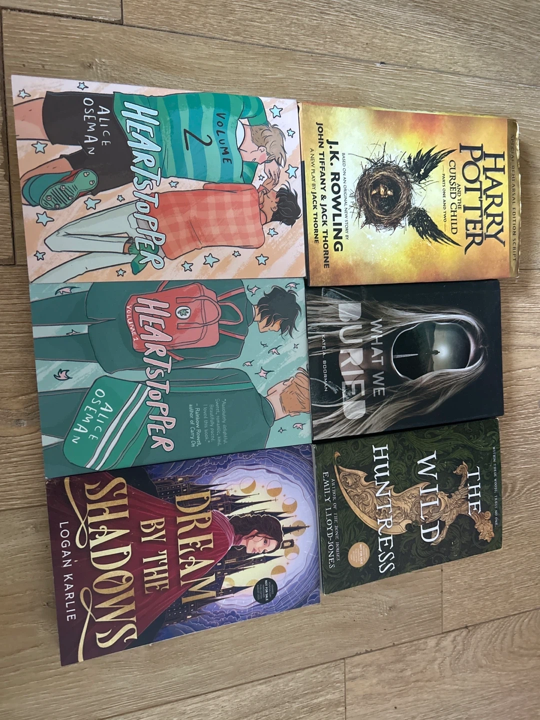 Accidentally bought duplicates of heartstopper, you can take just the heartstopper books for $10. Two advanced reading fantasy novels. What we buried originally bought from a Public Library, Harry Potter Limited edition.
