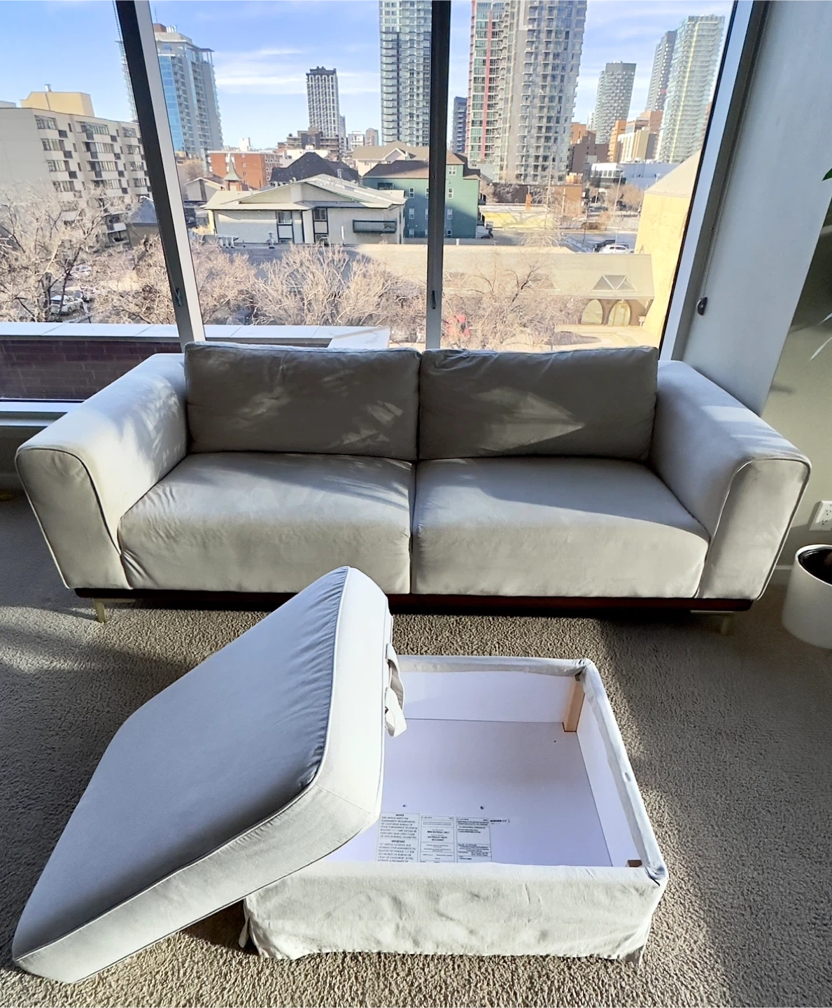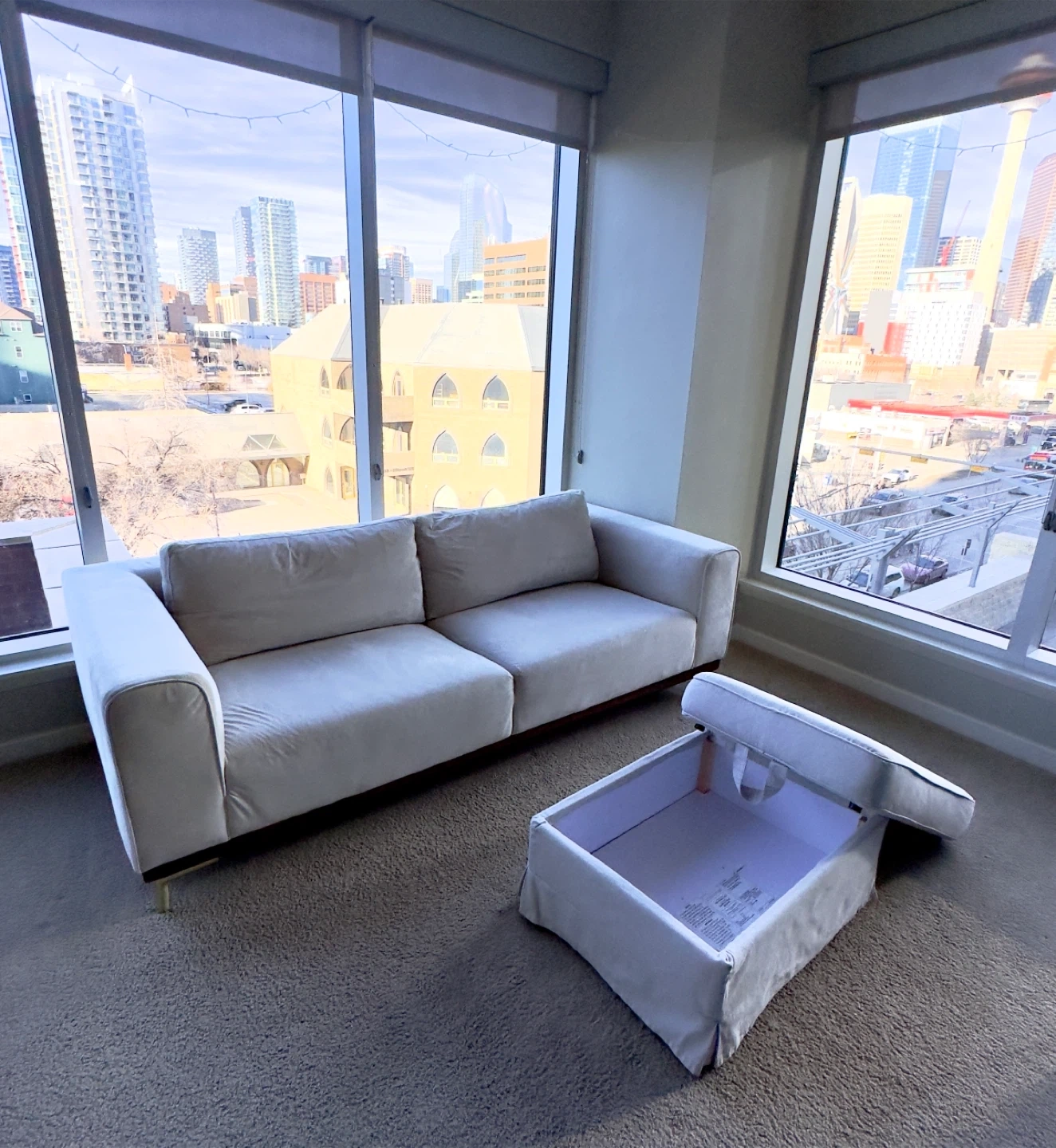 Looking for a cozy addition to your living space? This comfortable beige sofa is perfect for relaxing and comes with a matching ottoman featuring built-in storage.