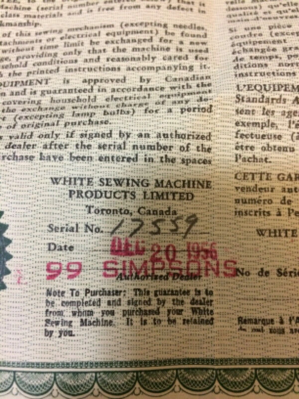 For sale is a vintage 1956 Dressmaster rotary sewing machine and stand, made by White. This collectible machine has a dark grey (slightly greenish) finish and a heavy-duty, industrial vibe. It includes the original guarantee certificate and bobbin. The motor runs, the light works, and the pedal is functional. I recently tested it, and it sews well in both forward and backward directions (see photos for stitch examples). The compact table measures approximately 30” tall x 16.5” deep x 23” wide. It folds out to a 46.5” work surface and has a handy drawer for sewing notions. The table is dark wood with some minor wear. The machine folds down into the cabinet for storage. Great for sewing projects or as a unique addition to a vintage sewing machine collection. Asking $100. Located near the Burlington/Oakville border.