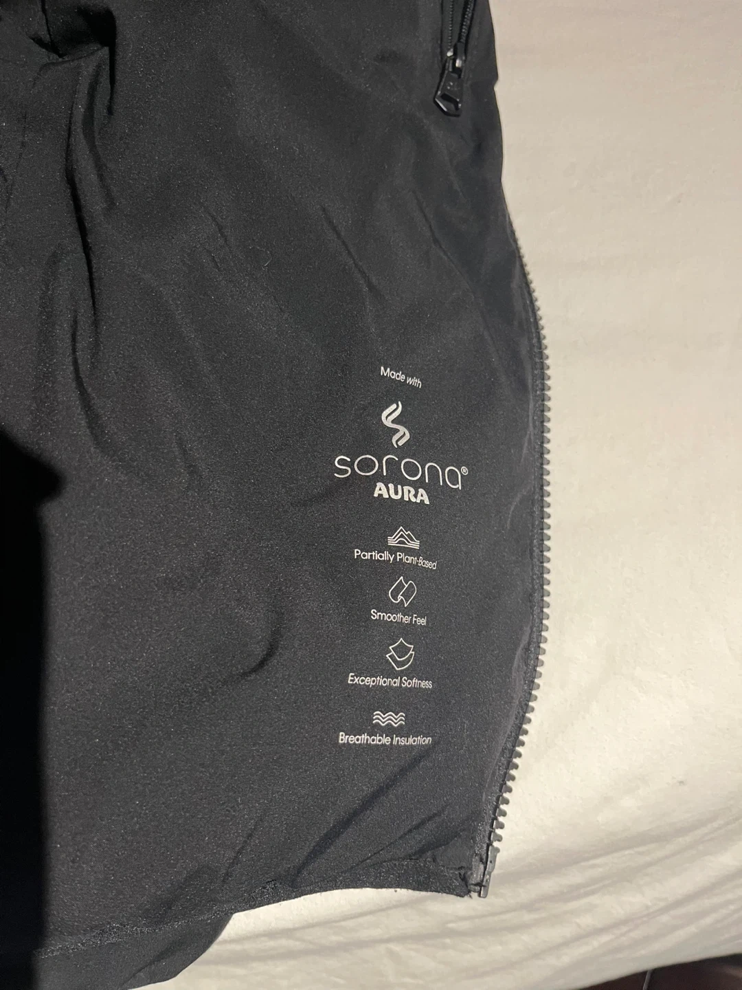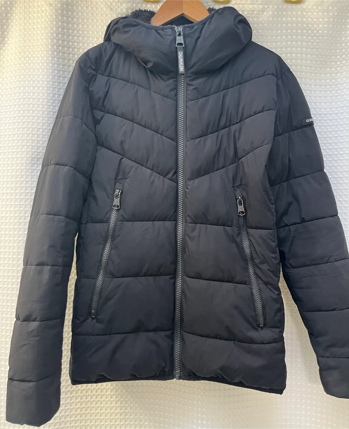 Black Calvin Klein puffer jacket. Size is S but can fit M too. Made with Sorona Aura, offering a smoother feel and exceptional softness. Breathable insulation for warmth. Has a soft, cozy hood!
