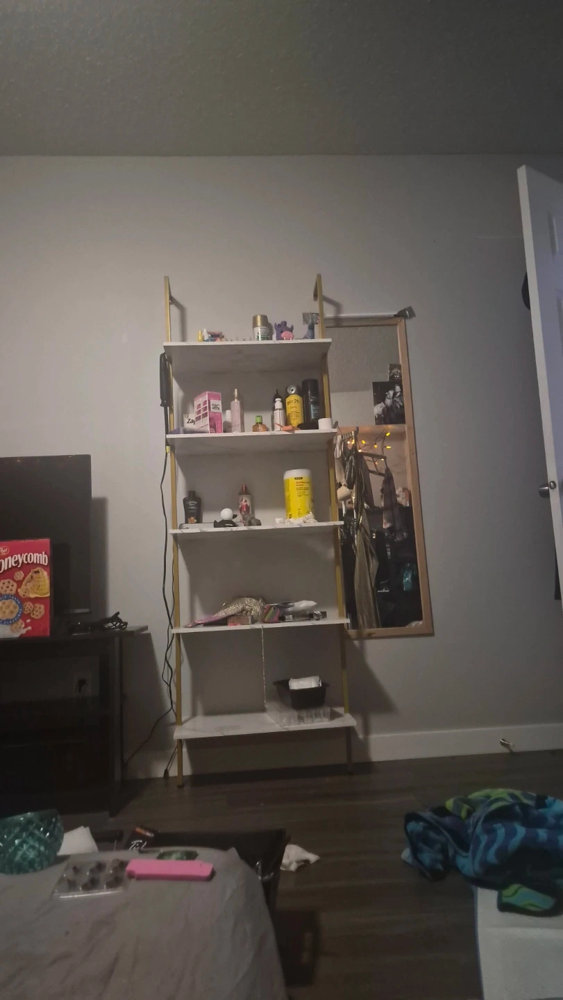 This is a multi-use storage unit with a gold frame and marble-look shelves. It's great for organizing items in any room. Dimensions are approximately 5 feet tall and 1.5 feet wide.