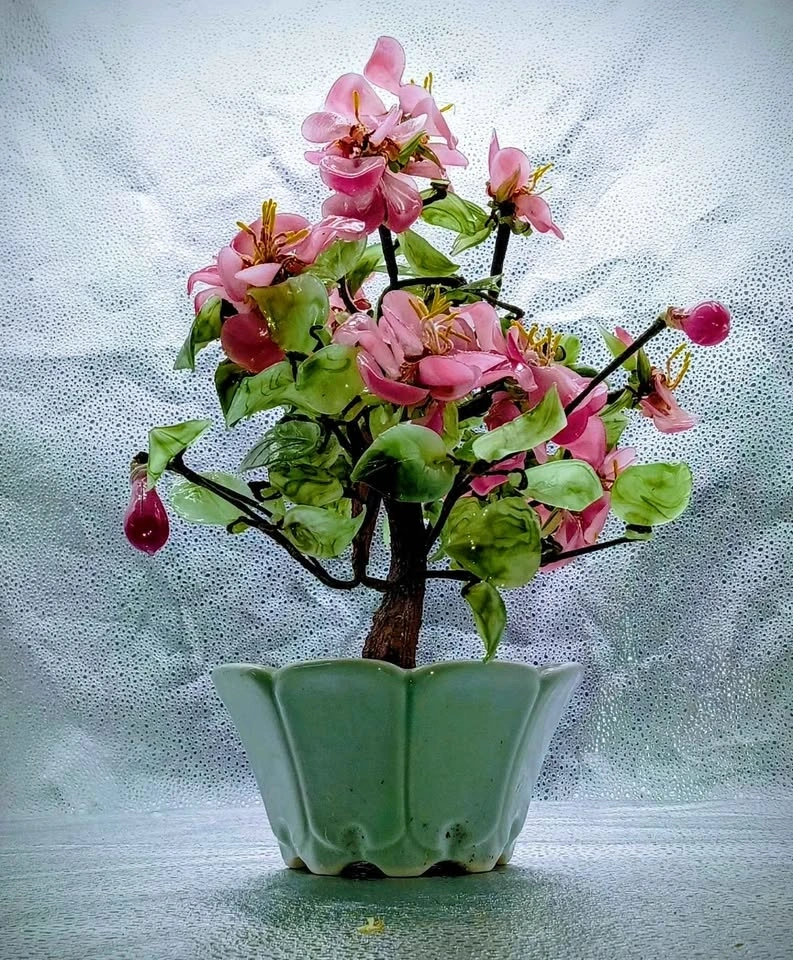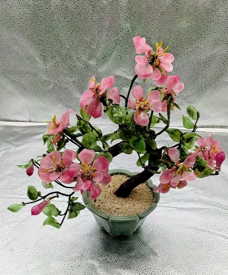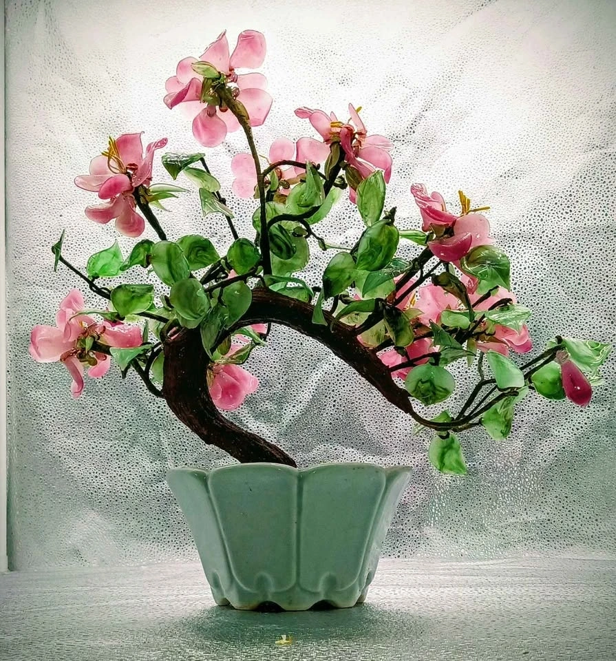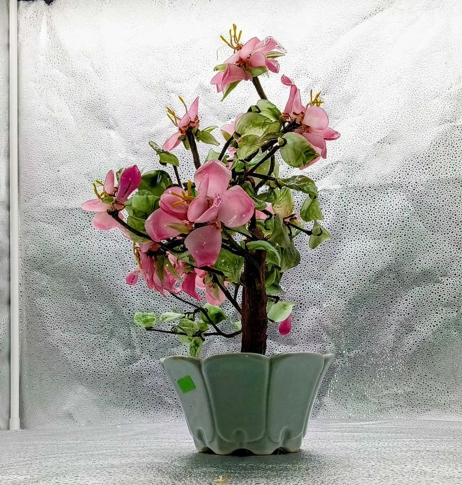 Chinese glass and jade stone cherry blossom bonsai tree sculpture. Features pink glass flowers, green jade leaves, and a celadon-colored ceramic pot. Intricately designed to represent balance and harmony, featuring adjustable petals and leaves.