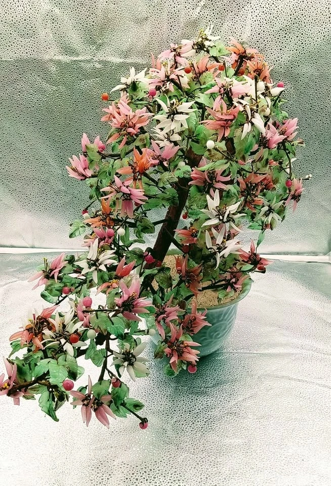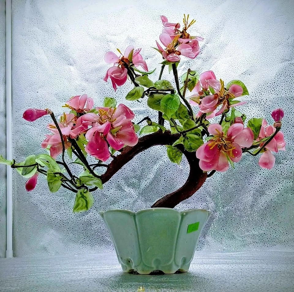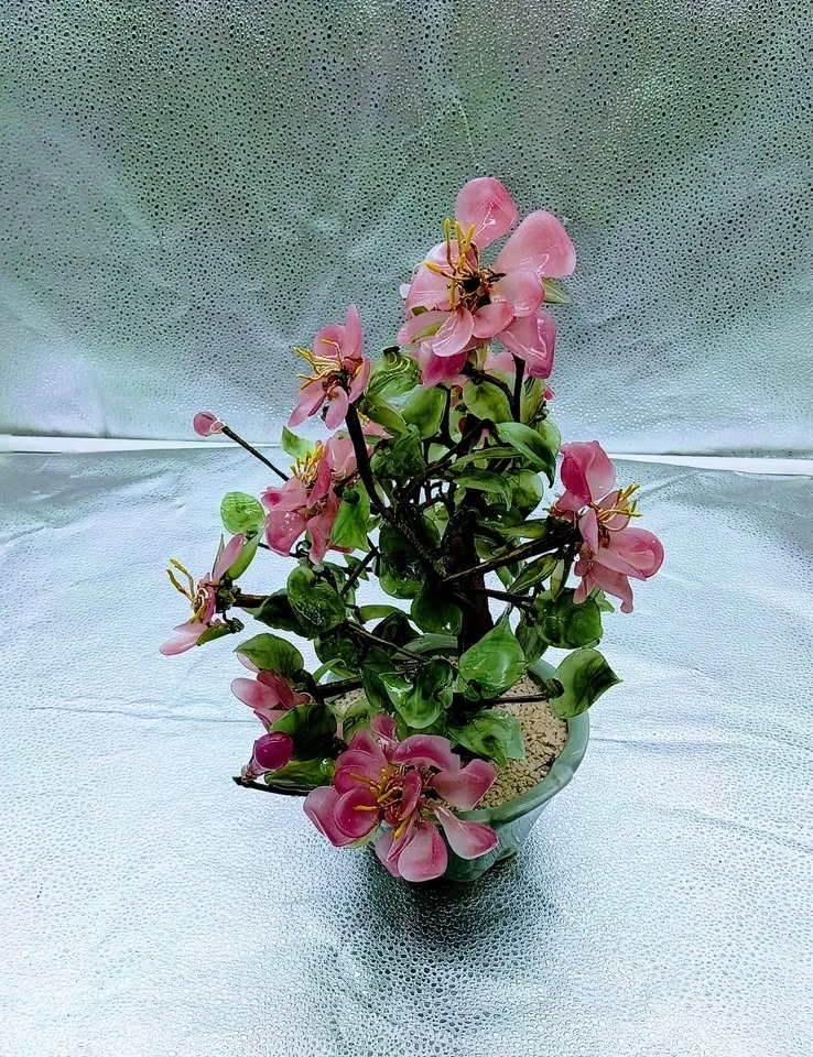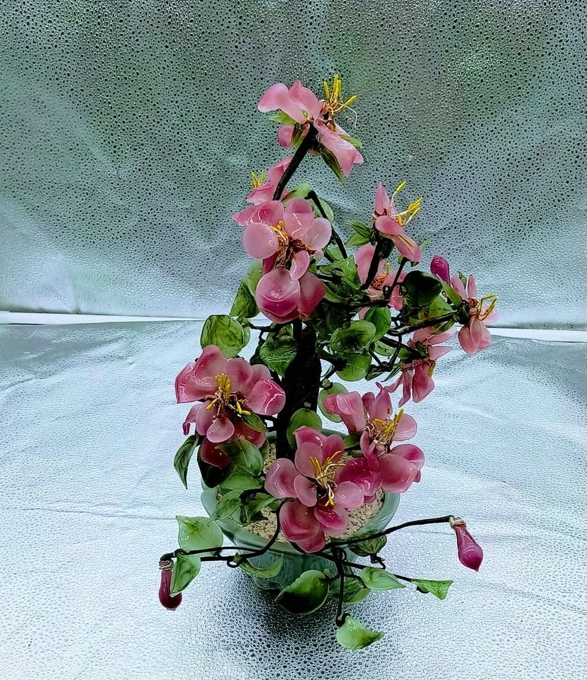 Chinese glass and jade stone cherry blossom bonsai tree sculpture. Features pink glass flowers, green jade leaves, and a celadon-colored ceramic pot. Intricately designed to represent balance and harmony, featuring adjustable petals and leaves.