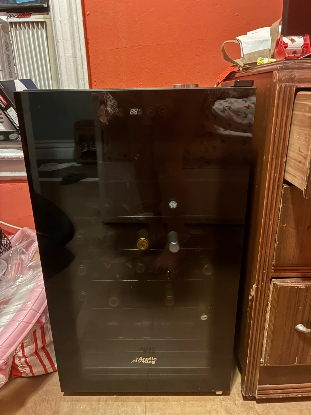 This is an Arctic King wine cooler refrigerator. It's black with a glass door. It has multiple shelves for wine bottles. This would be useful for someone looking to store and chill their wine collection. Can hold over 30 bottles