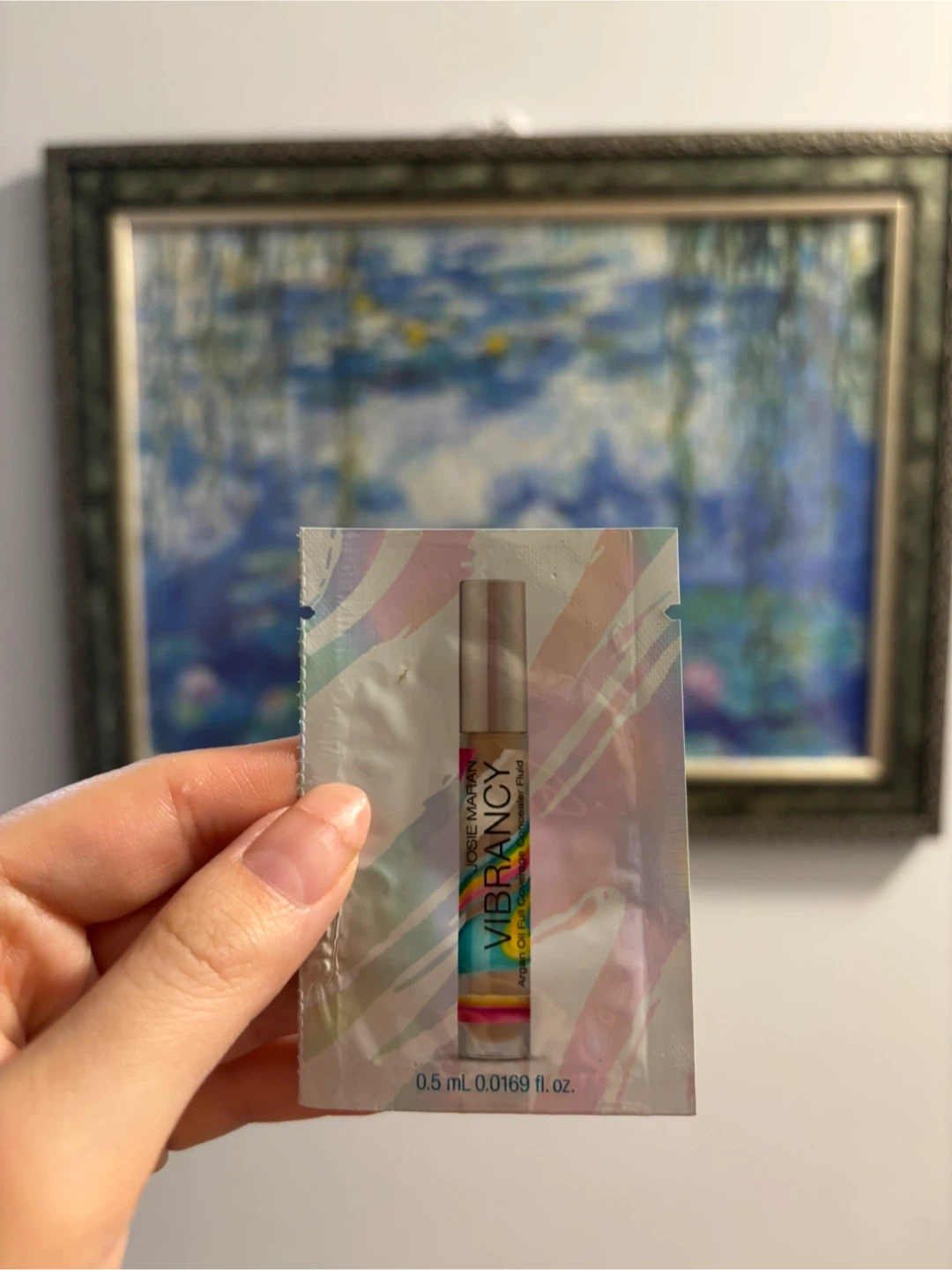 Sample size of Vibrancy Full Coverage Concealer Fluid in medium tan. It provides full, long-wearing coverage with a natural finish. Apply to skin and blend with fingertips.