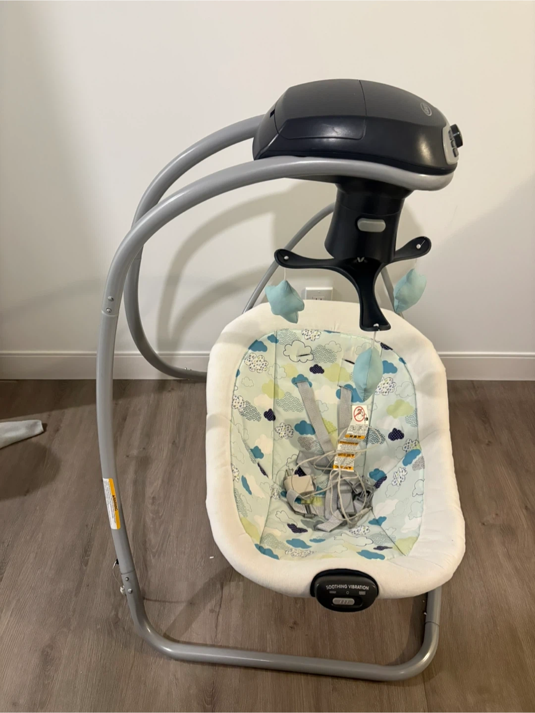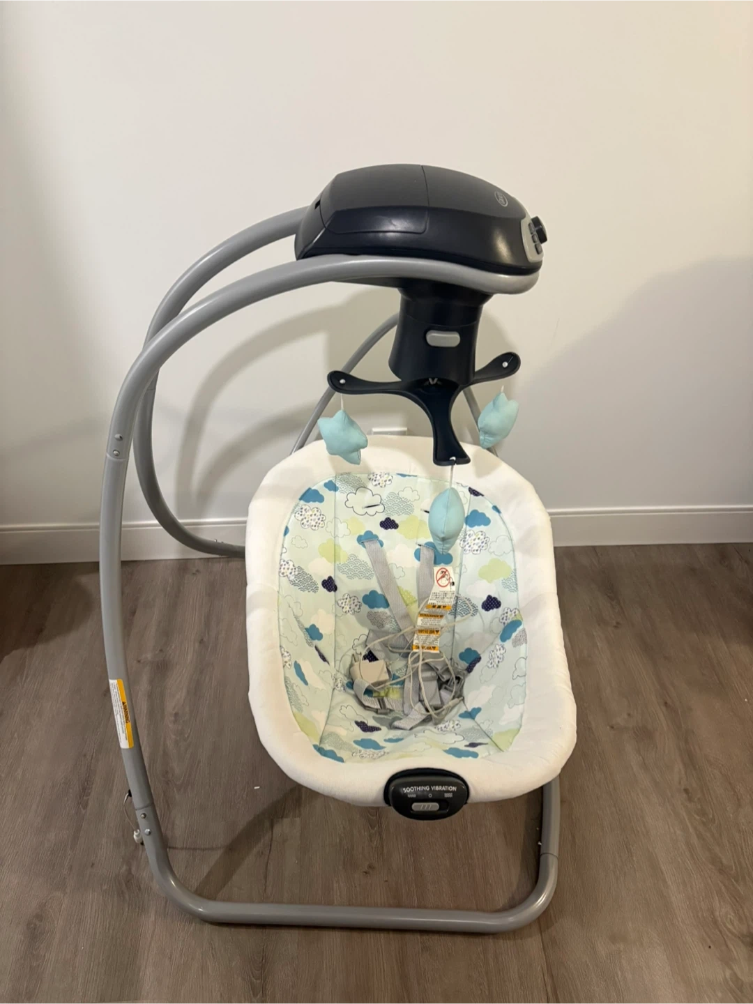 This Graco baby swing provides a safe and soothing space for your little one. It features multiple speed settings and a gentle vibrating function to help calm your baby. The cute cloud and blue pattern on the seat is lovely. It's perfect for keeping your baby content and relaxed!