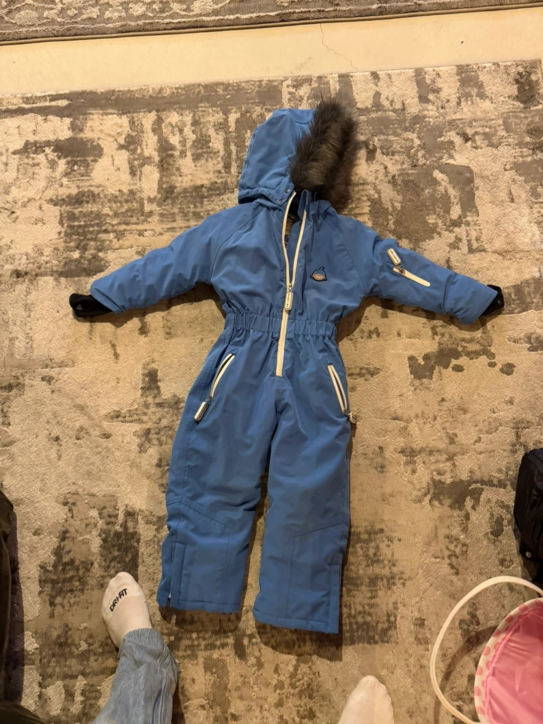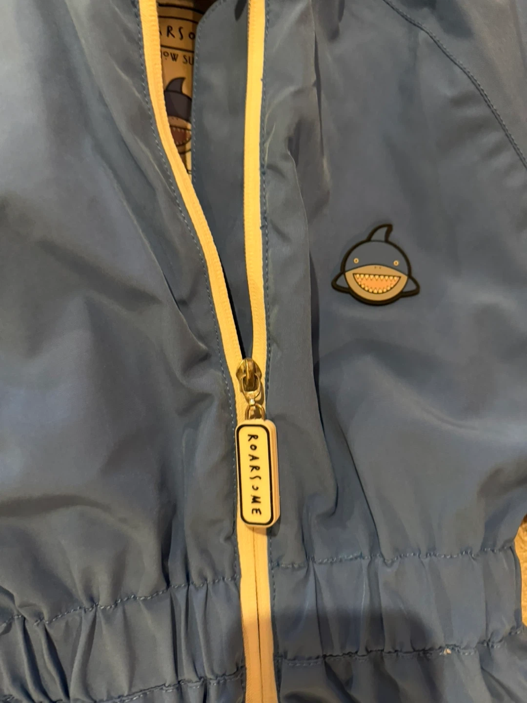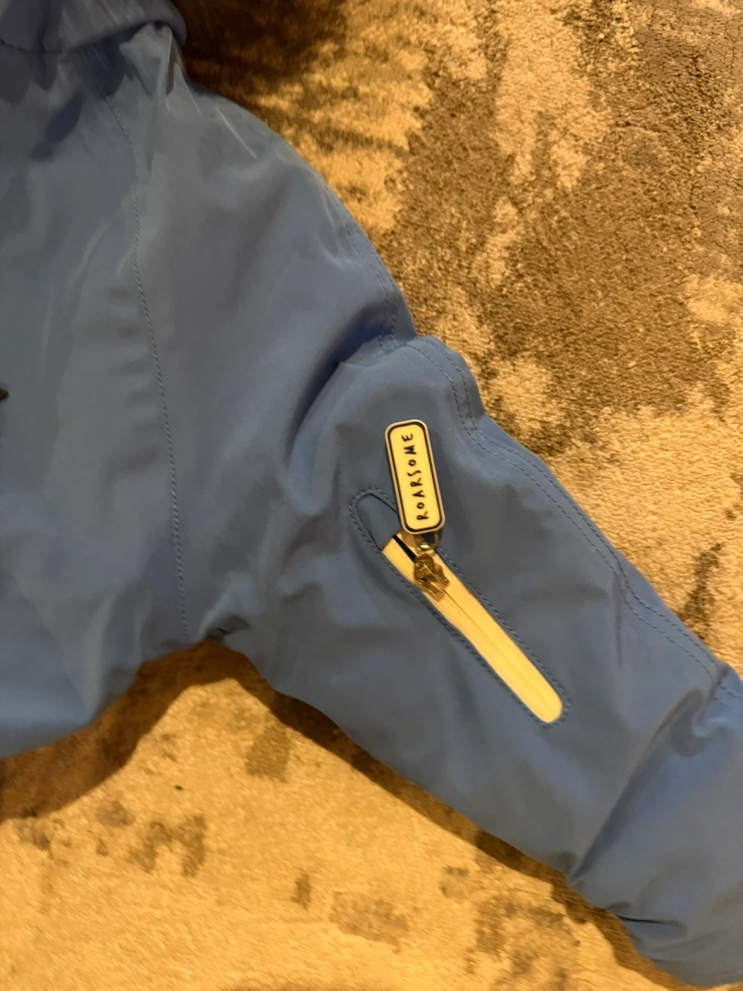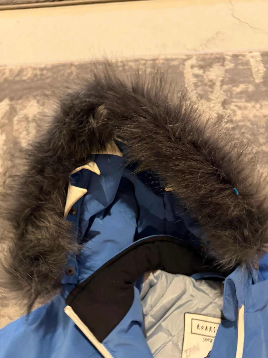 This is a blue Roarsnow snowsuit for kids. It features a faux fur-lined hood and front zipper closure. The material is water-resistant, perfect for snowy days!