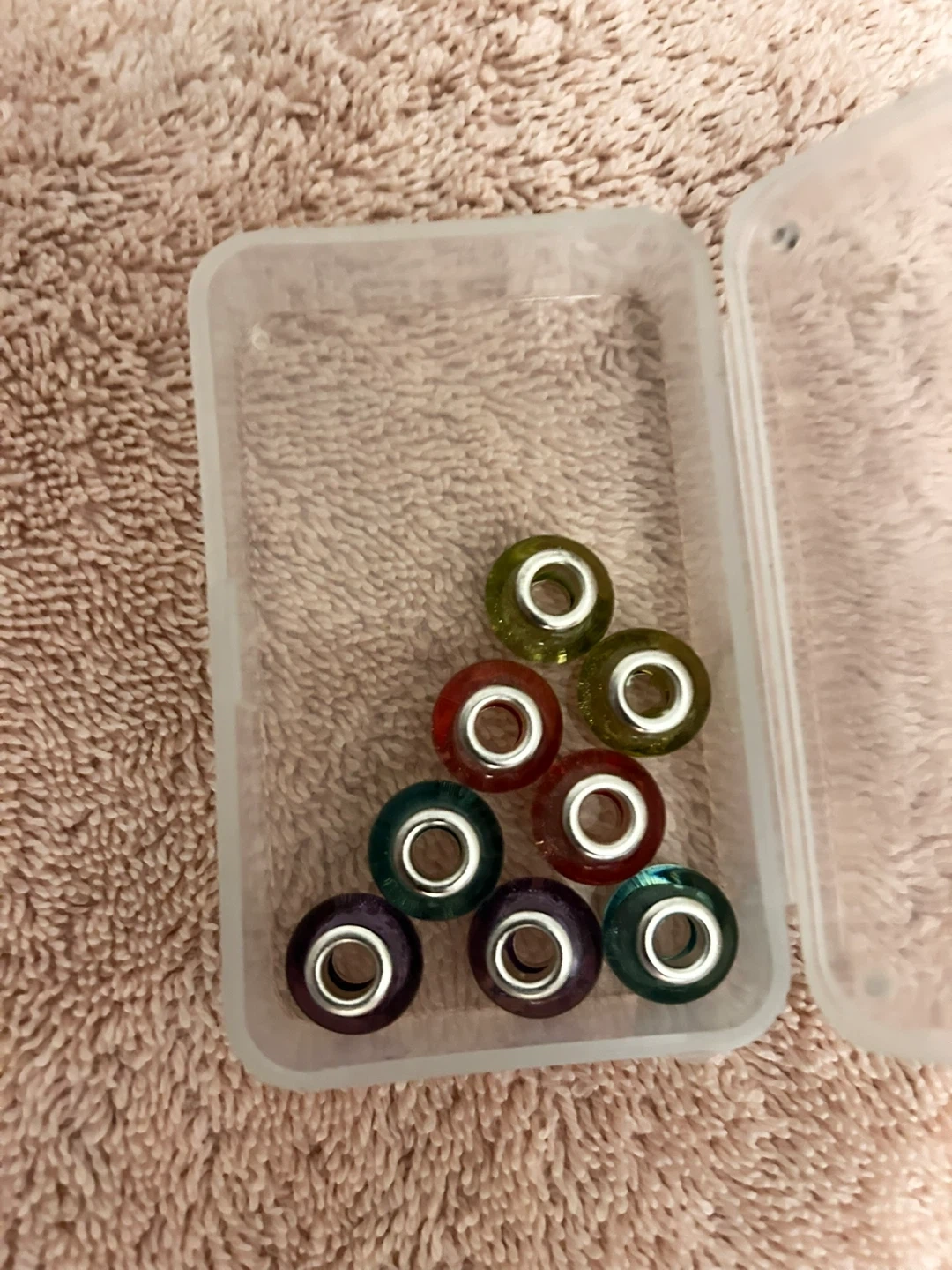 Set of 10 colourful rainbow spacer beads for jewellery making. They feature a rainbow striped design with a silver-tone core. These beads are perfect for adding a pop of colour to bracelets or necklaces.