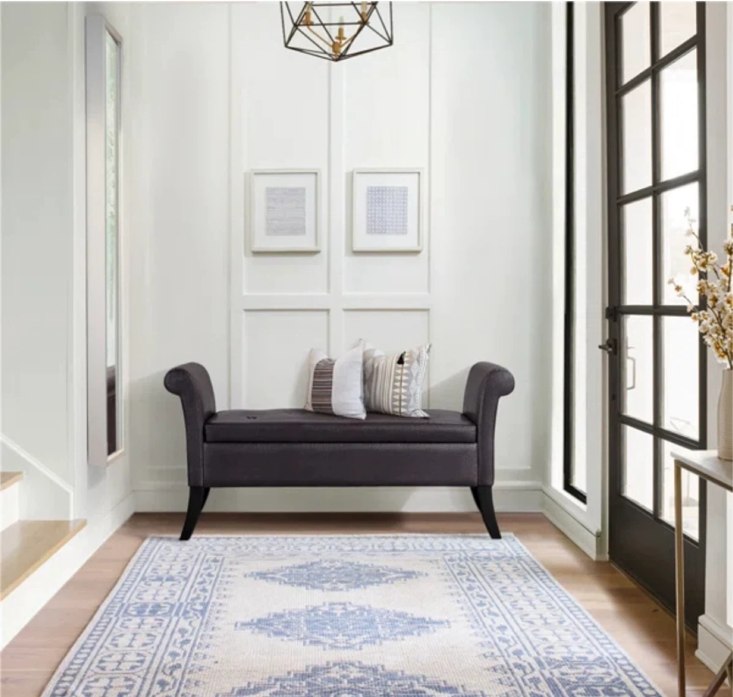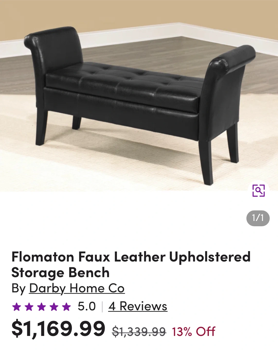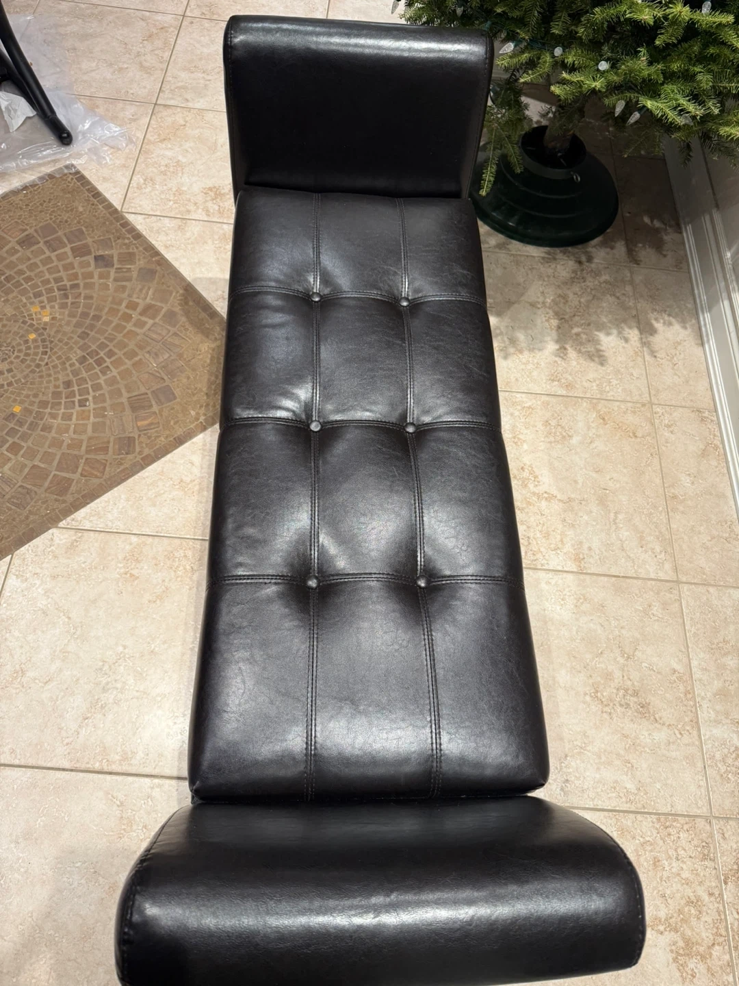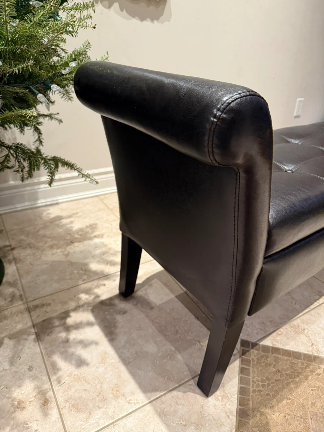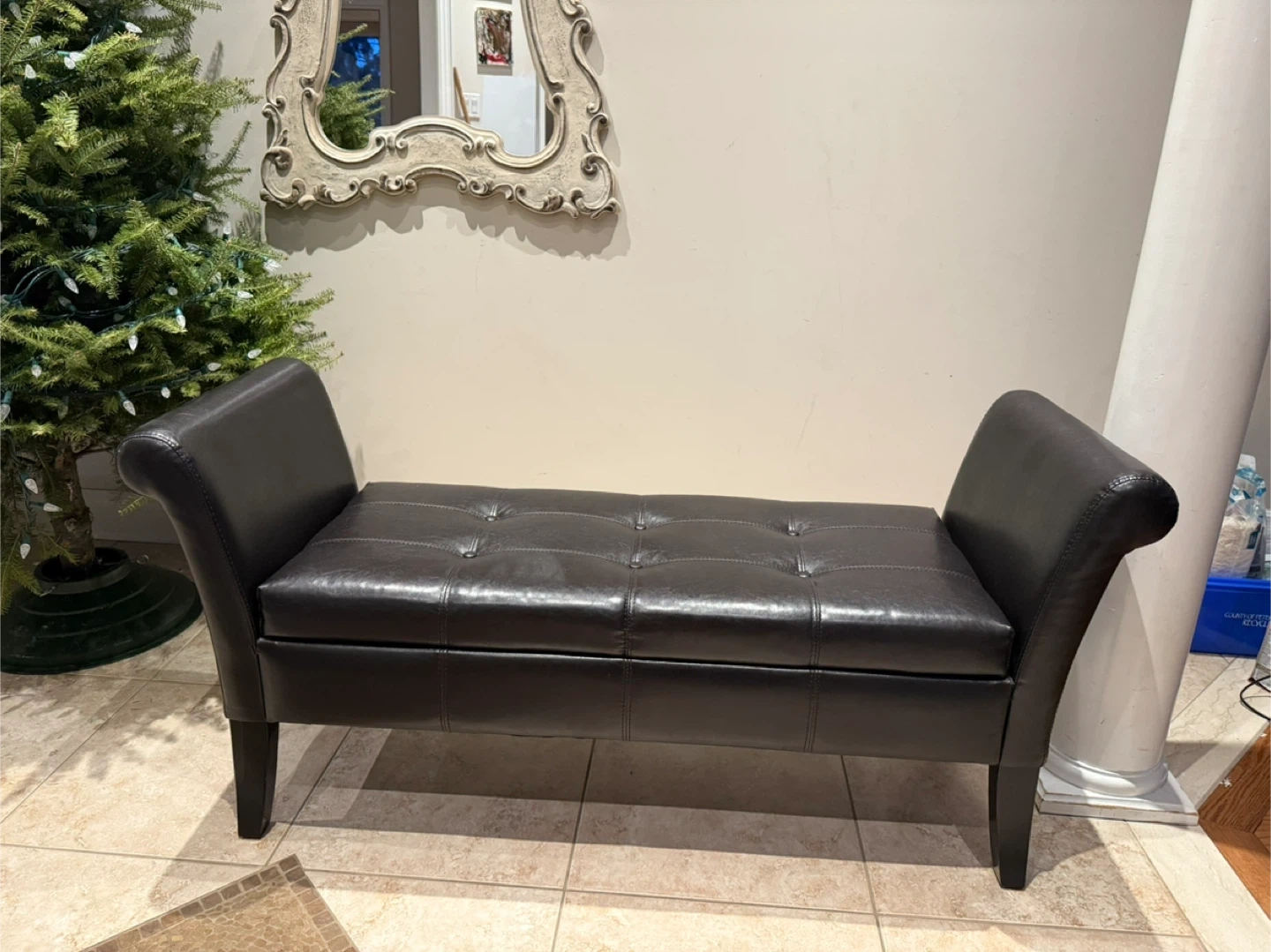 Here's a stylish Dark Brown faux leather storage bench! It's in excellent shape and would be perfect for an entryway, bedroom, or living room. It has a tufted seat and a good amount of storage space inside