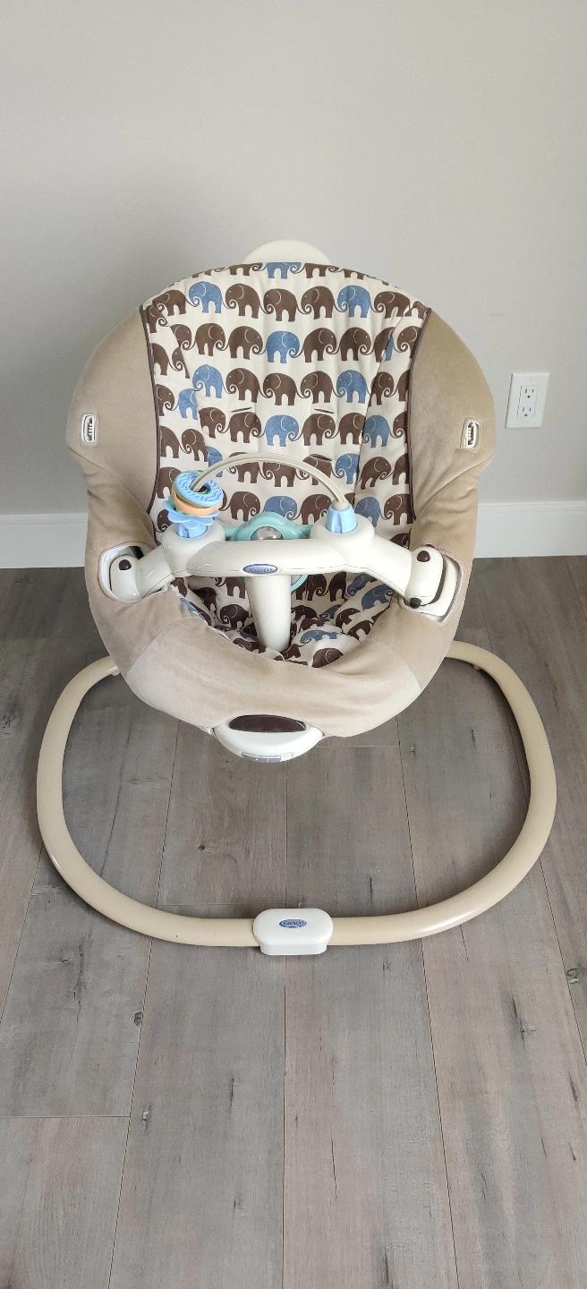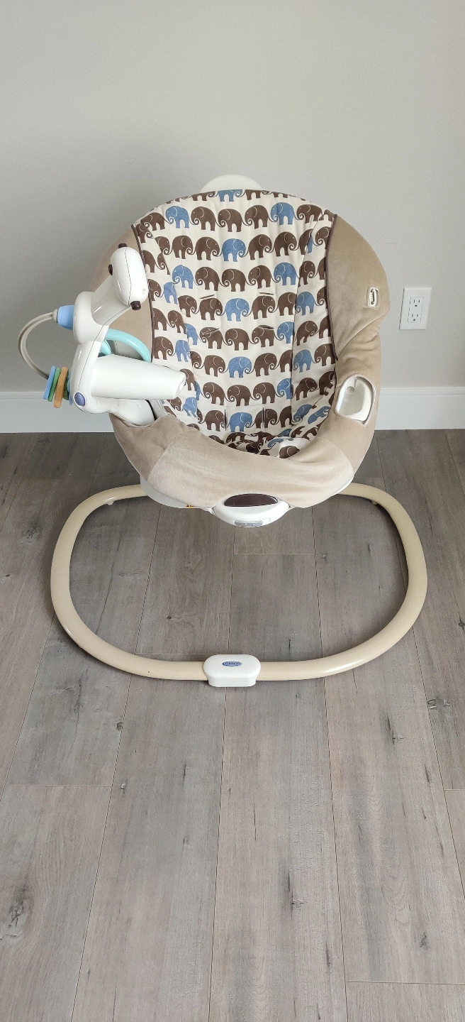 110Infant swing, beige and brown elephant pattern. Features vibration, music, and toy bar. Gently used. You can connect mobile for any music, automatic swing with multiple speeds. The most customizable soothing options to please your baby Patented MomMotion™ scientifically developed to mimic your soothing motions 4 seating positions and 3 recline positions to mimic the way you hold baby Removable seat with vibration doubles as a convenient floor rocker Option of AC plug-in or battery operation for added flexibility Frame thoughtfully designed to hold most Graco infant car seats 15 songs and sounds to soothe and amuse baby Plug-in for MP3 players allows you to play baby’s favorite songs 6 swing speeds allow you to adjust to baby’s mood Engaging toy tray to amuse and delight baby QuietMotor technology Machine washable cloth seat pad for comfort and convenience more details: https://www.babygearexpo.com/Graco_Sweet_Peace_Soother_Swing_p/grcoswpcsw.htm