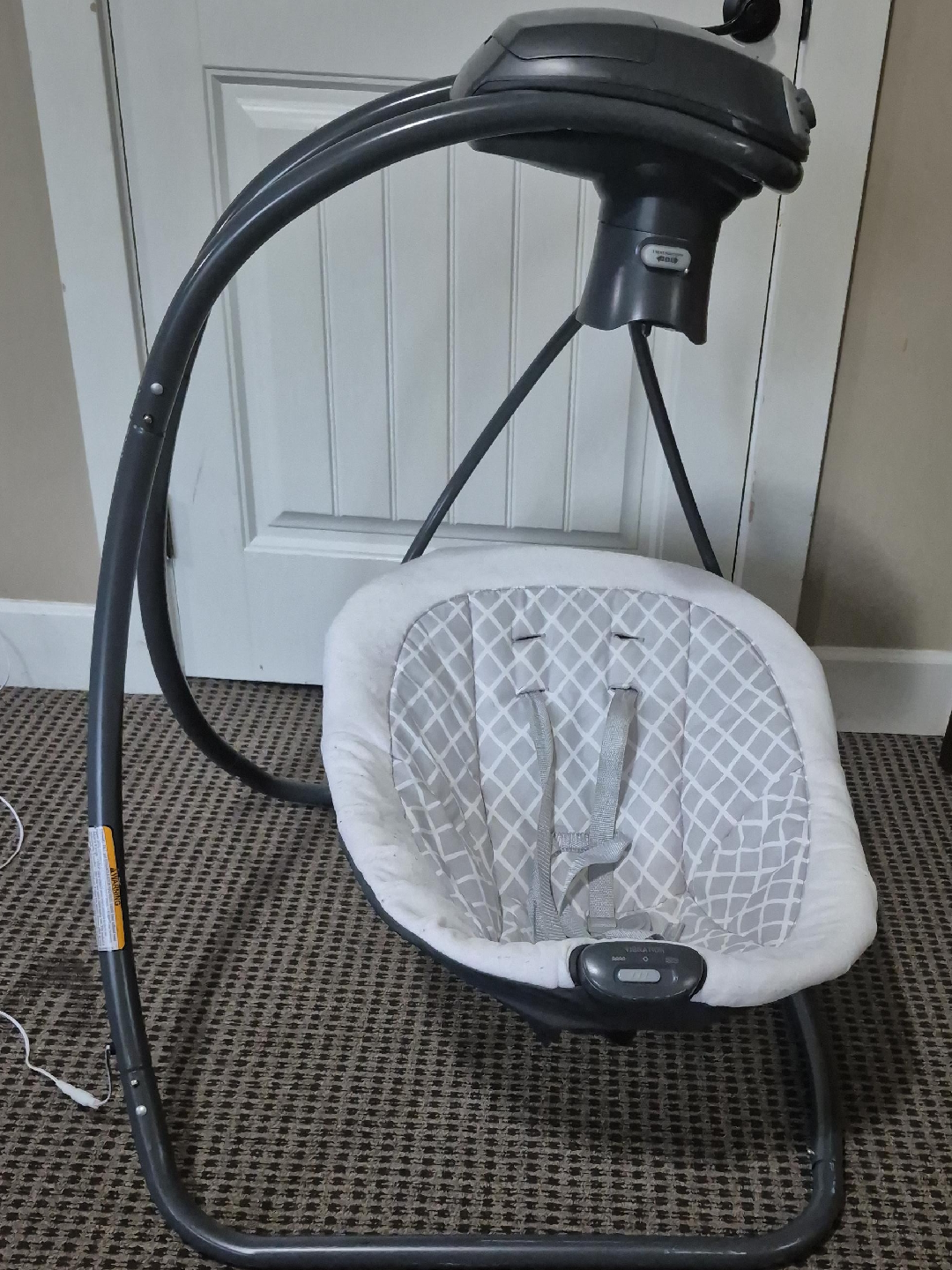 Selling a gently used Graco baby swing! It's in great condition and ready for a new little one. The seat has a comfy white and grey patterned fabric, and the frame is a neutral grey colour. Perfect for soothing your baby with gentle swinging motions and vibrations