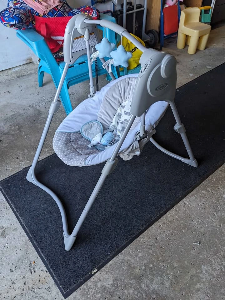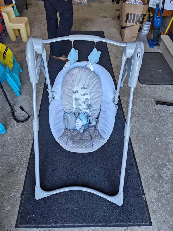 10Foldable and compact Adjustable swinging speed Overhead toy bar with 2 soft toys Infant head support keeps baby cozy and can be removed as baby grows 5-point harness with fabric covers Battery operated Baby Weight limit: 2.4-11.3 kg (5.5-25 lb) Selling it because my child outgrew it. Pick-up only - intersection William parkway and Highway 410