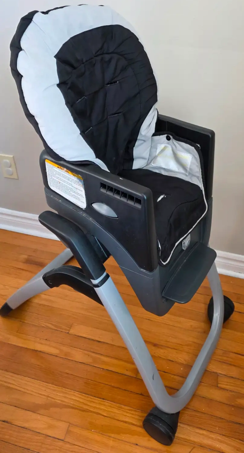 Graco highchair, black and grey. Adjustable height. Easy to clean. Folds for storage. Wheels for mobility. Tray included.