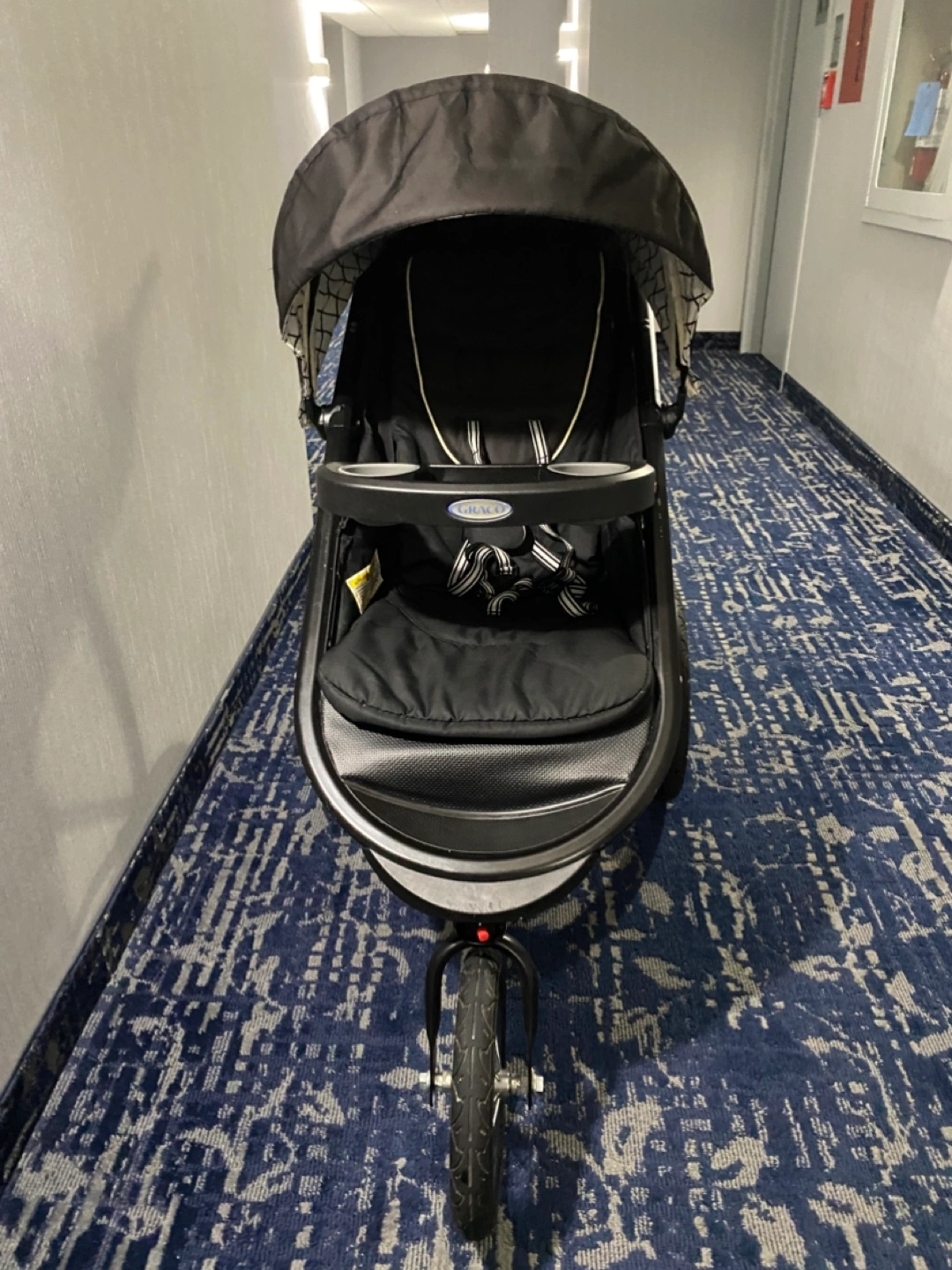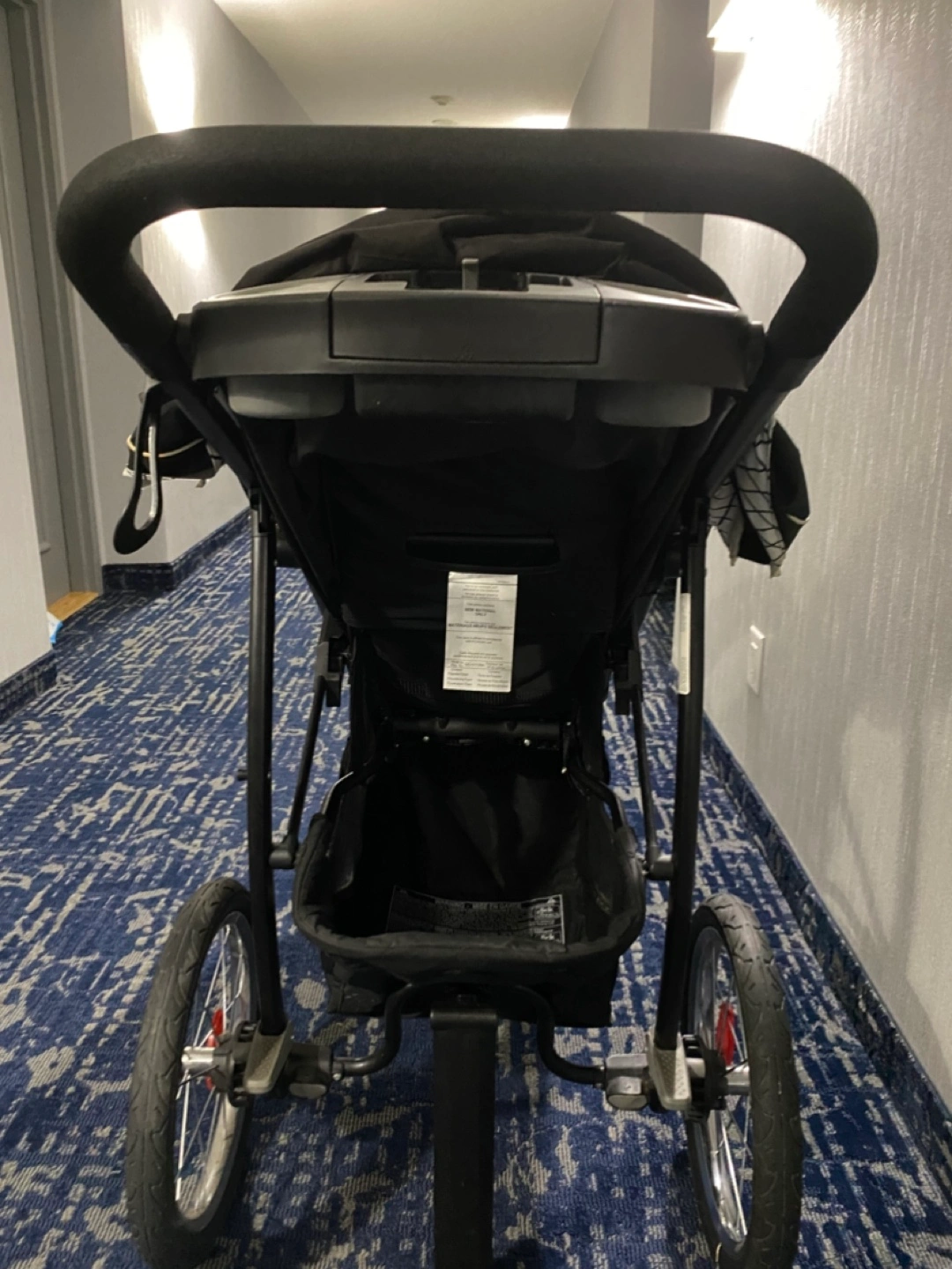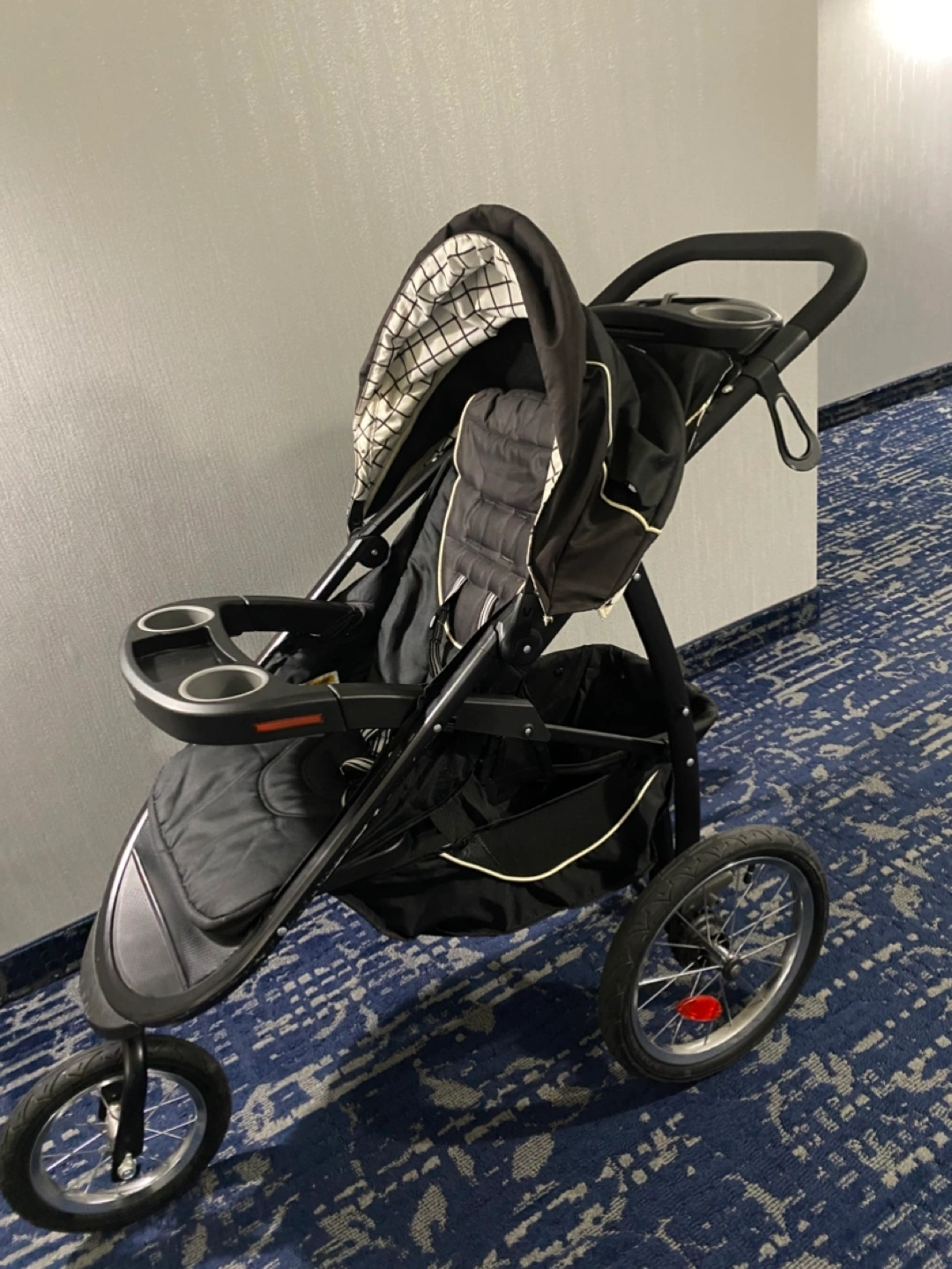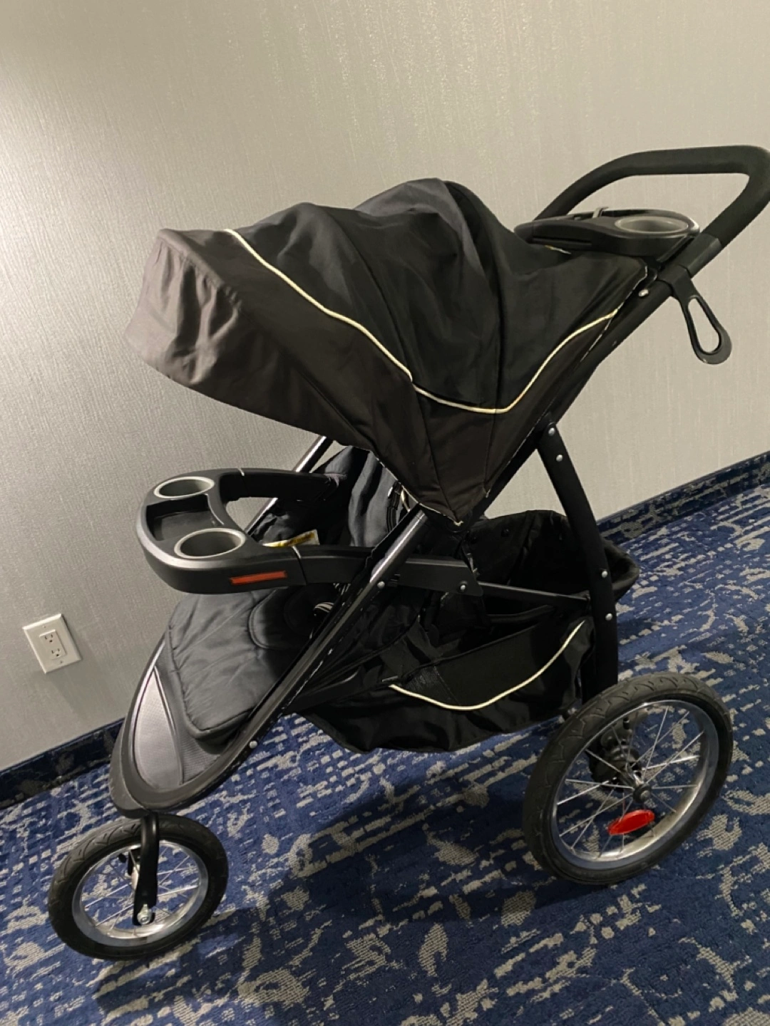 19Three-wheel stroller. Black fabric. Cup holders for parent and child. Large storage basket underneath. Adjustable canopy.