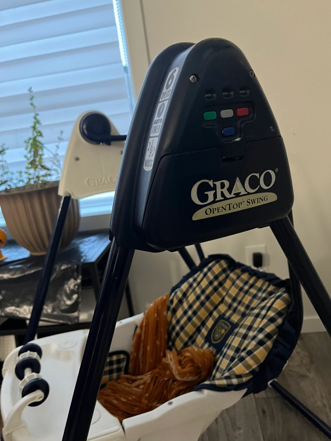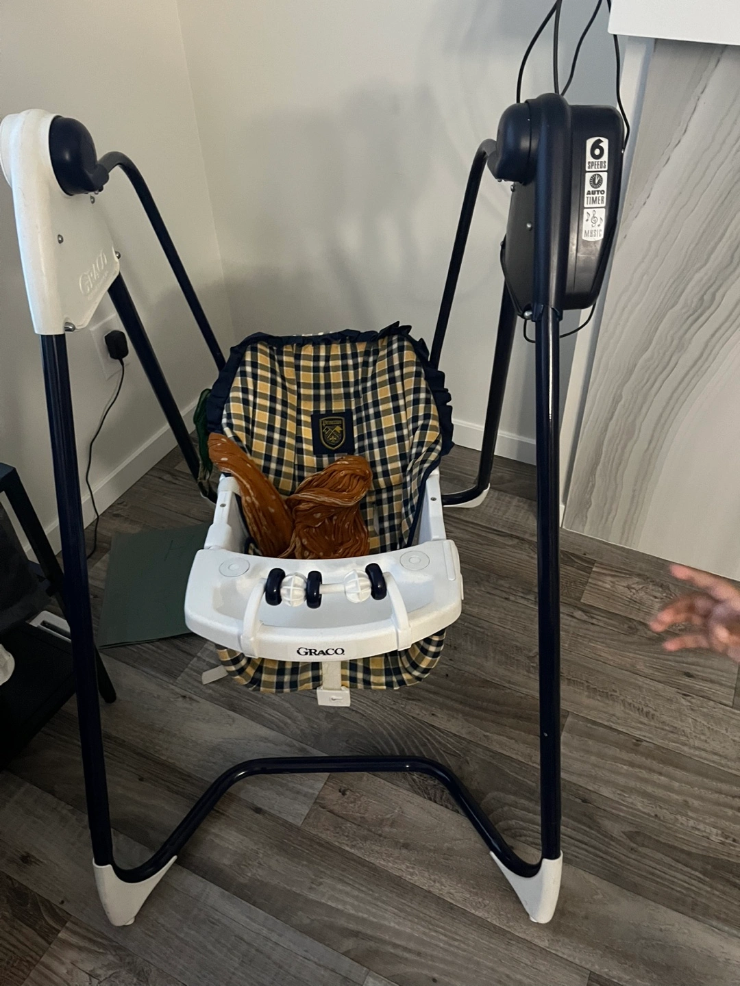 13Baby swing with multiple speed and timer settings. Includes a plaid seat cover.