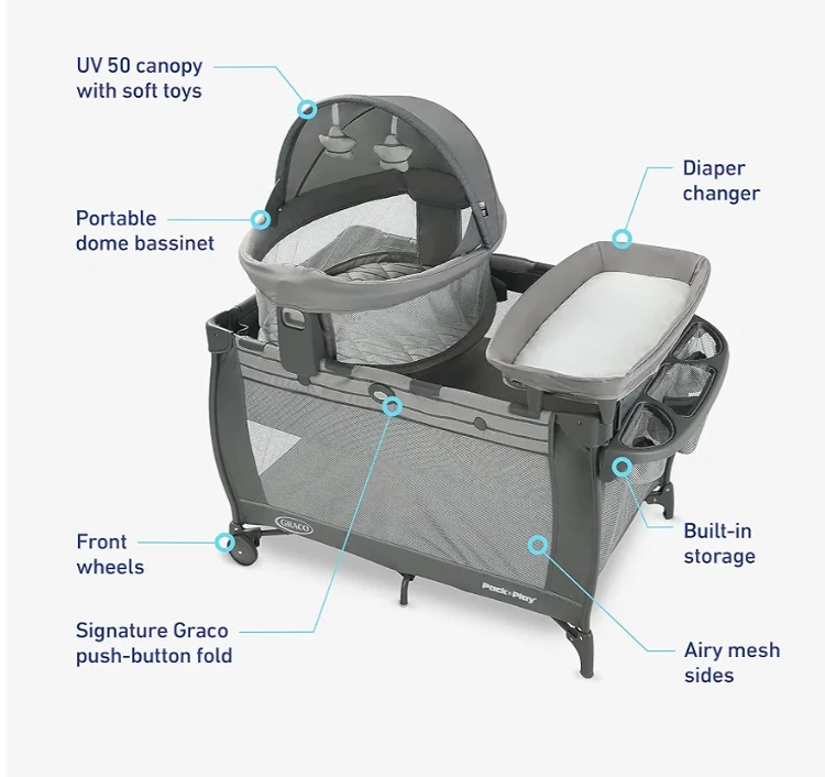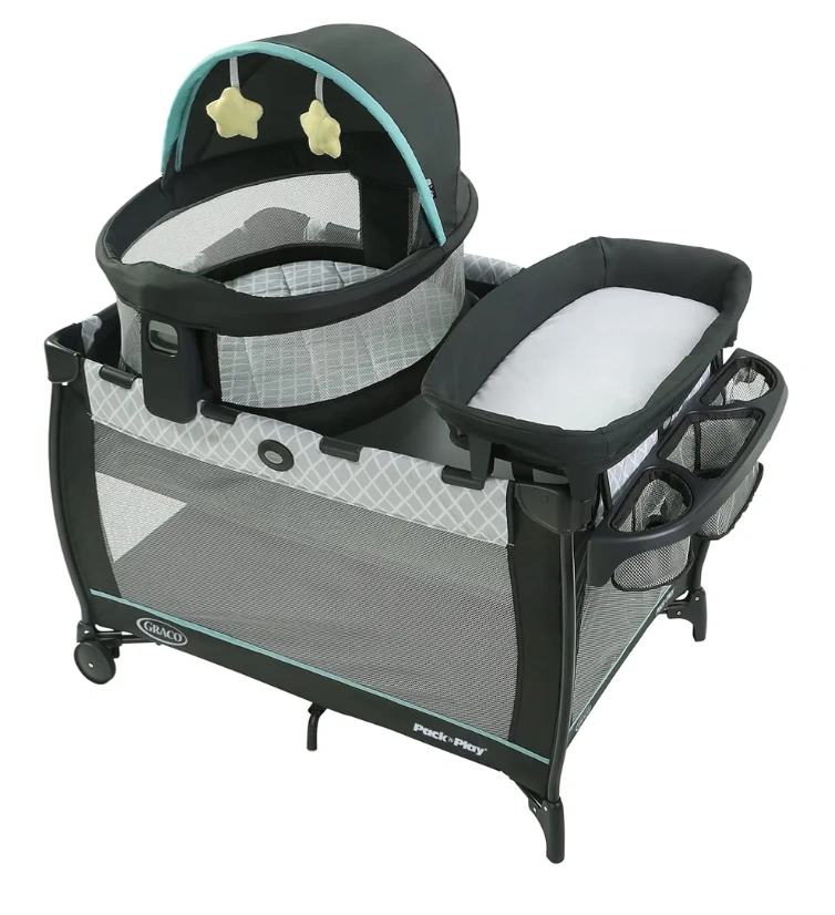 Selling a Graco Pack 'n Play playard in excellent condition! It features a portable dome bassinet, a diaper changer, and built-in storage. The UV 50 canopy comes with soft toys, and it has airy mesh sides for ventilation. It also has front wheels and Graco's signature push-button fold, making it easy to move and store