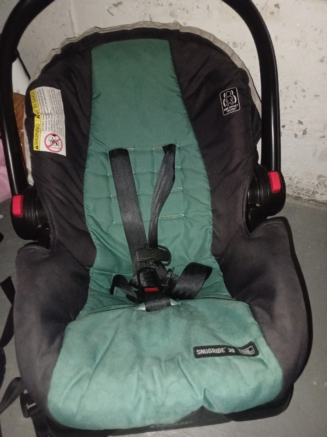 60Selling a Graco SnugRide 30 infant car seat in green. It's in good condition and ready for a new little one! This car seat is designed for infants and provides a snug and secure fit. It's lightweight and easy to carry, making it convenient for parents on the go. The SnugRide 30 features a comfortable seat and a 5-point harness system for added safety.