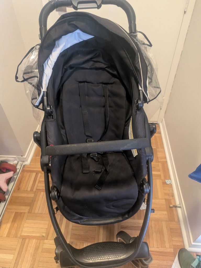 Selling a gently used Graco stroller in black! It's in great condition and ready for a new family. Perfect for walks around the neighbourhood or trips to the park, this stroller is a reliable choice for your little one's comfort and safety. Compatible with Graco Click connect 35. Toddler seat end is broken & missing the strap pads. Includes rain & net cover.