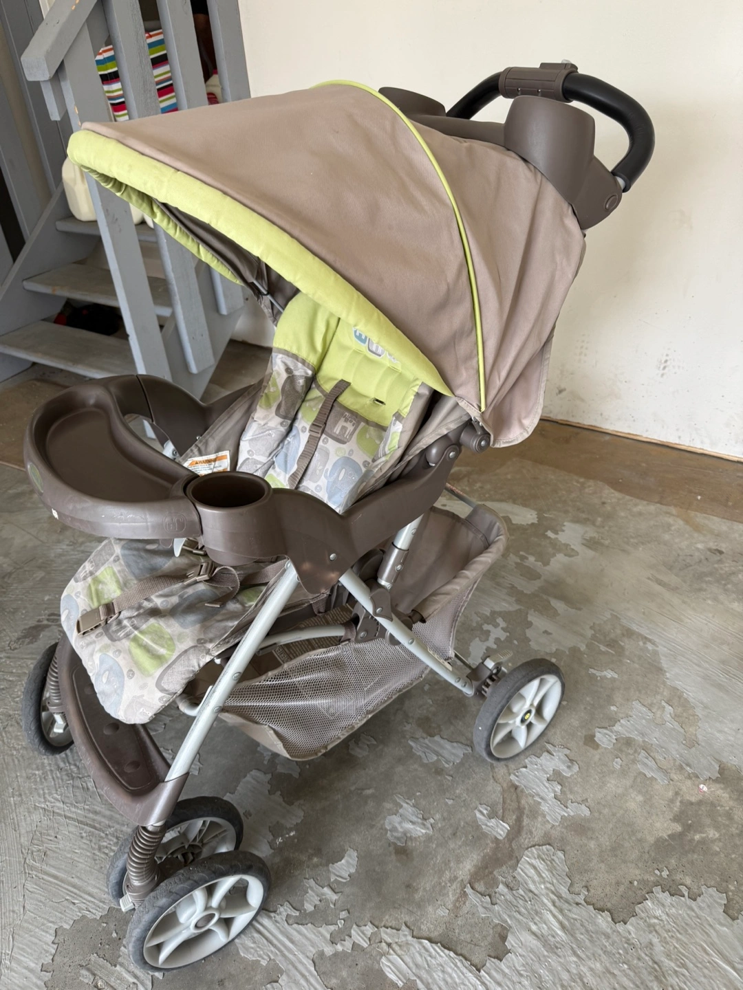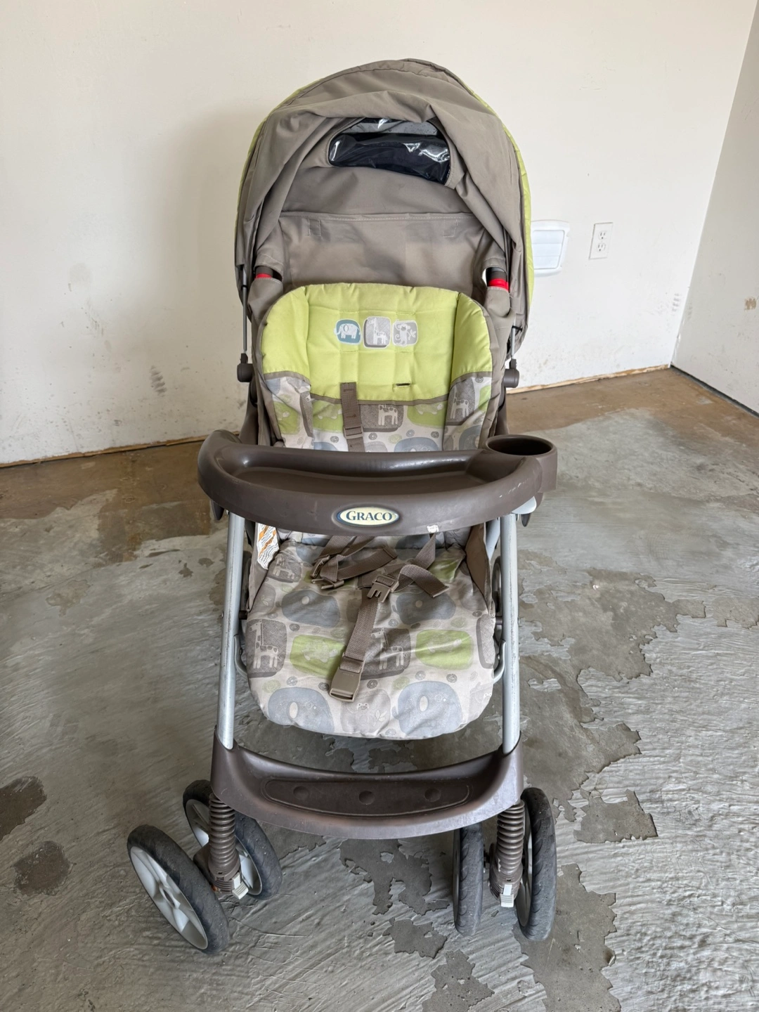 Selling a used Graco stroller! It's in great condition and ready for a new family. It features a convenient parent tray with cup holders and a storage basket underneath for all your essentials. The seat has a cute pattern with elephants and other animals. Perfect for walks around the neighbourhood!