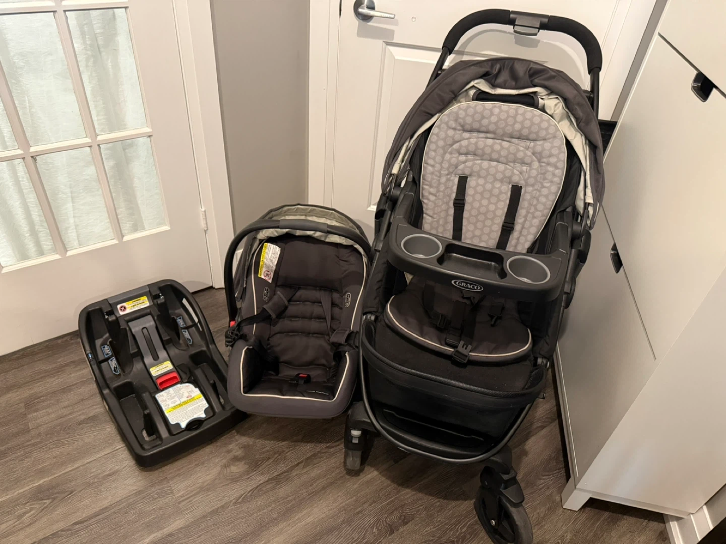 10Selling a Graco travel system that includes a stroller, infant car seat, and the base for the car seat. Also a Rain cover , Bug cover , Baby carrier and a JJ Cole winter cover. Pet Free , Smoke Free hom. Condition very new . Expiry of car seat 2027. Stroller can be used even after that. The stroller has a handy parent tray with cupholders and a storage basket underneath. Also included is a baby carrier and some extra padding for the car seat!