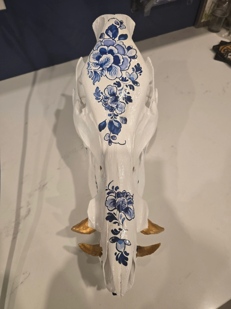 One of a kind German trophy wild boar skull in a Delft Blue style! The skull is painted white with blue floral designs, reminiscent of traditional Delftware. A cool and quirky piece of art for your home CASH ONLY