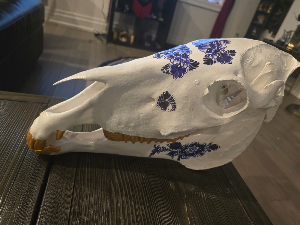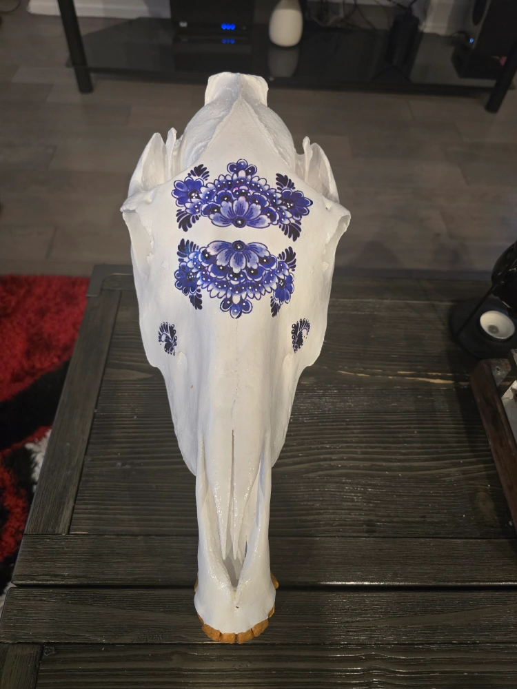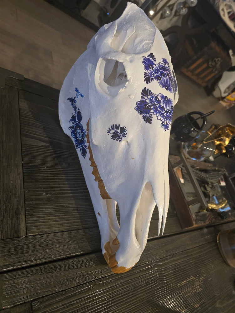 Unique decorated horse skull, perfect for adding a touch of the unusual to your home decor. The skull is painted white with blue floral designs, giving it a Delftware-inspired look. A striking piece for any collector or lover of unique art CASH ONLY