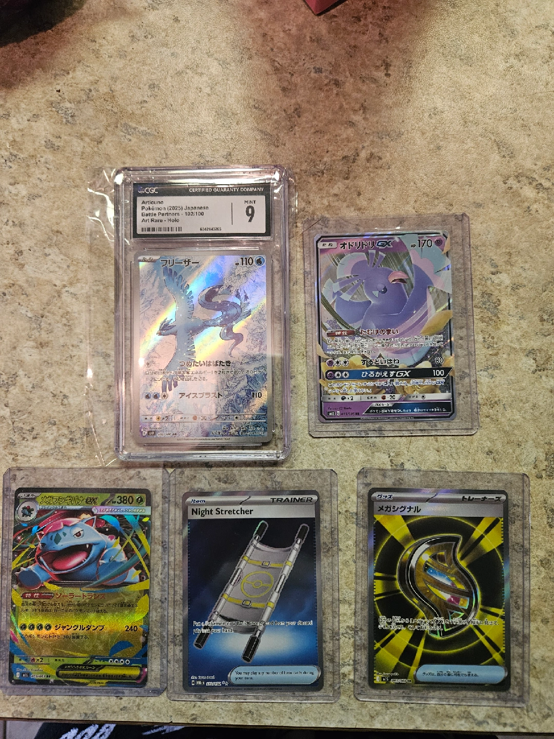Selling a collection of graded and sleeved Pokemon cards! Includes: - CGC graded Articuno (2025) Japanese Battle Partners 102/100 Art Rare Holo, Mint 9 - Oricorio GX - Mega Venusaur EX - Night Stretcher Trainer card - Mega Signal Trainer card