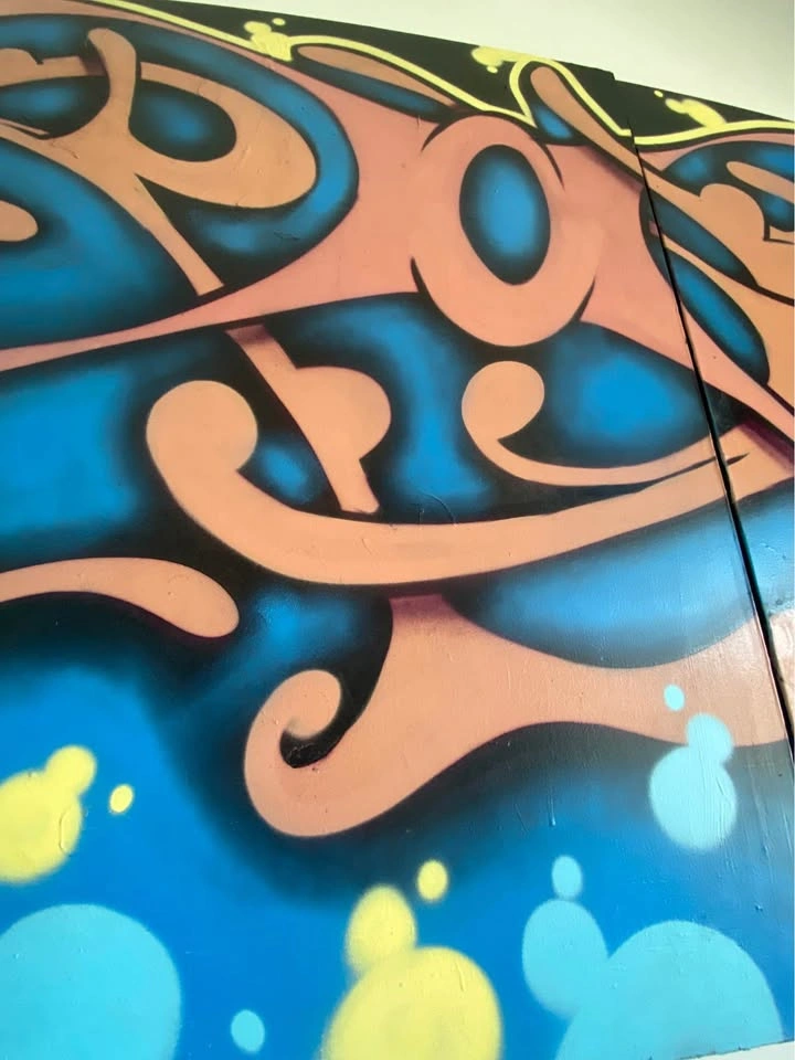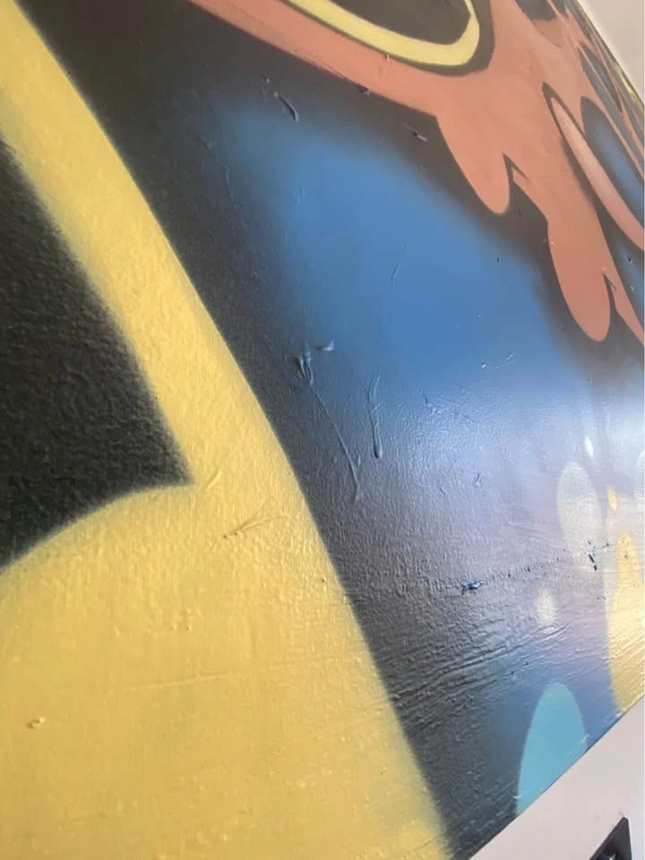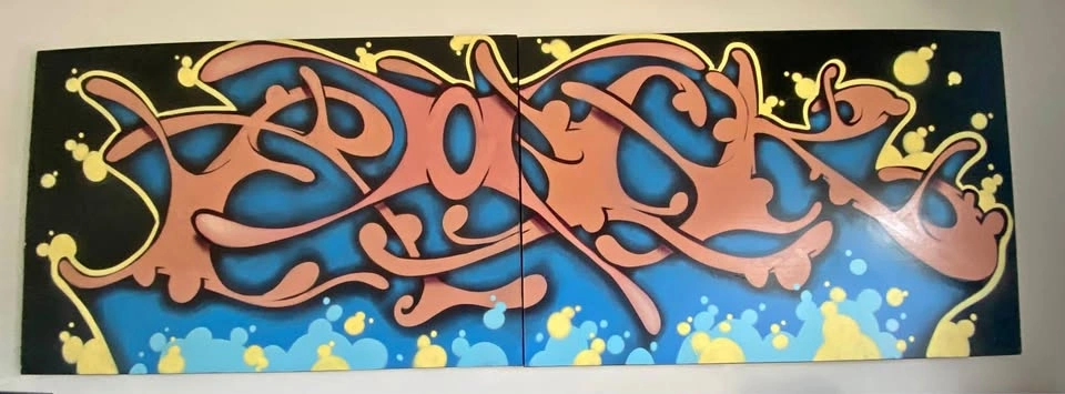 This is a one of a kind Original Graffiti Art piece by renowned muralist and street artist “Rock” AKA “Death”. The graffiti reads R O C K. This is two pieces a left 4ft X 6ft and a right 4ft X 6ft canvas piece come together to complete the entire 4ft X 12ft Art Piece. This awesome yet very large piece needs a big wall. It is the center piece to my games room and is always talked about. It spent some time in a restaurant in Toronto and now resides with me. It has a few chips around the edges however it is still in great condition.