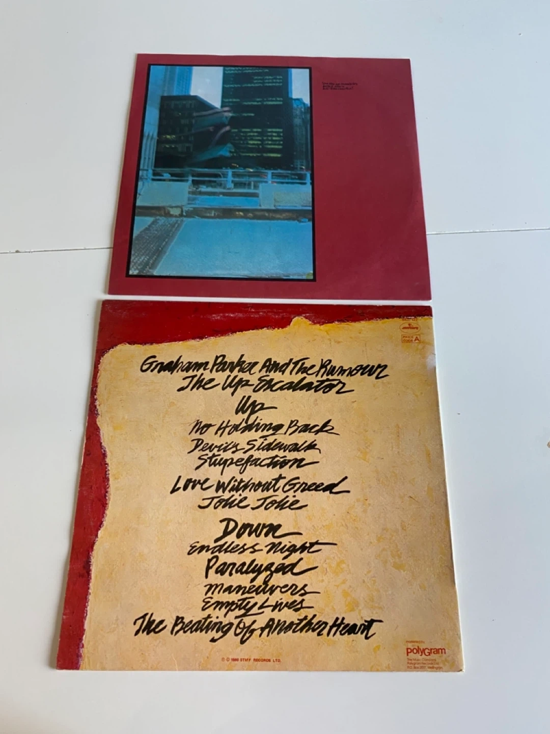 77Selling a vinyl record by Graham Parker and The Rumour, titled 'The Up Escalator' New Zealand Copy Side A includes: - Up - No Holding Back - Devil's Sidewalk - Stupefaction - Love Without Greed - Jolie Jolie Side B includes: - Down - Endless Night - Paralyzed - Maneuvers - Empty Lives - The Beating of Another Heart Pick up Sage Hill NW Cash only Check out my other records Pet and smoke free home