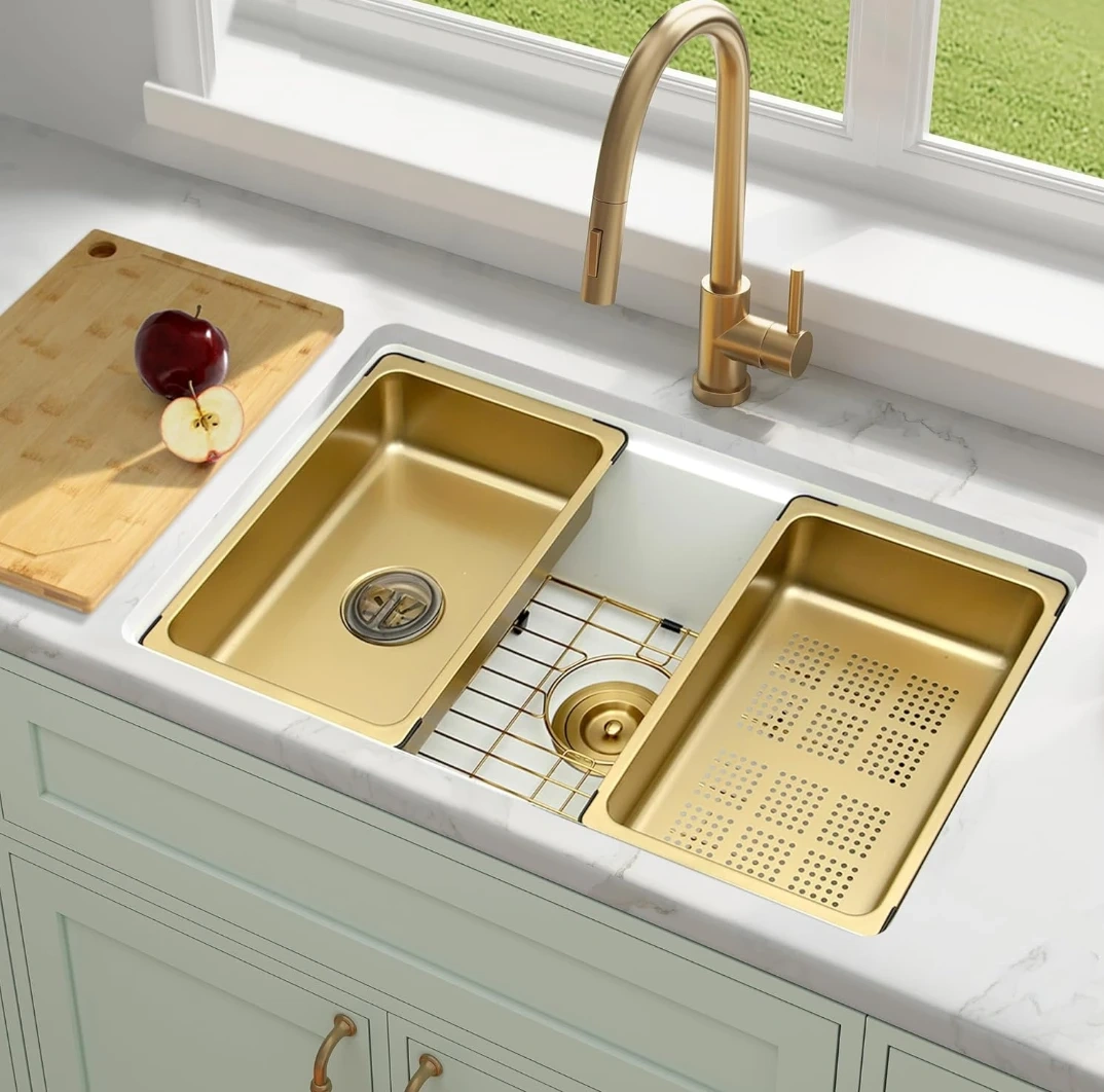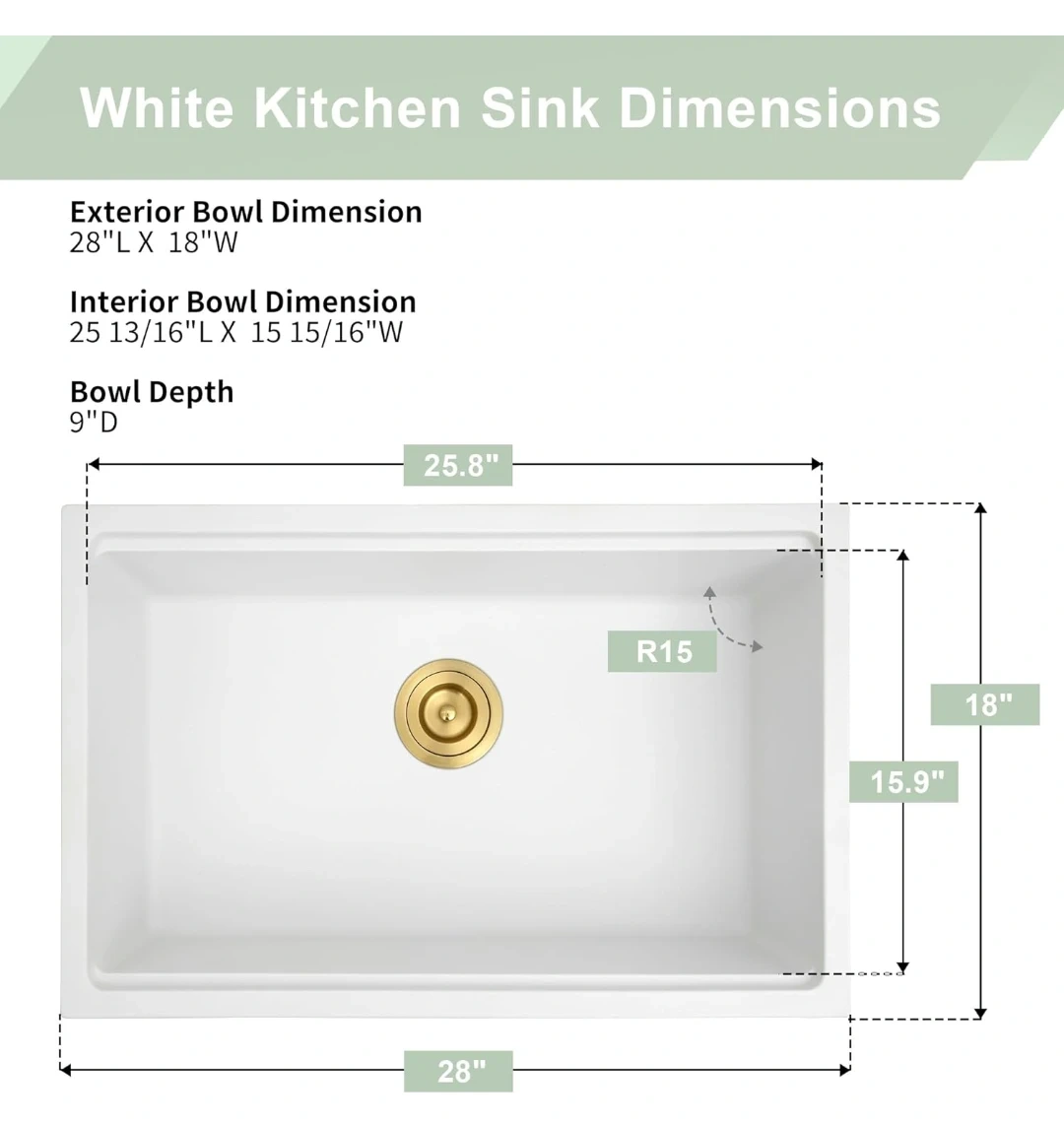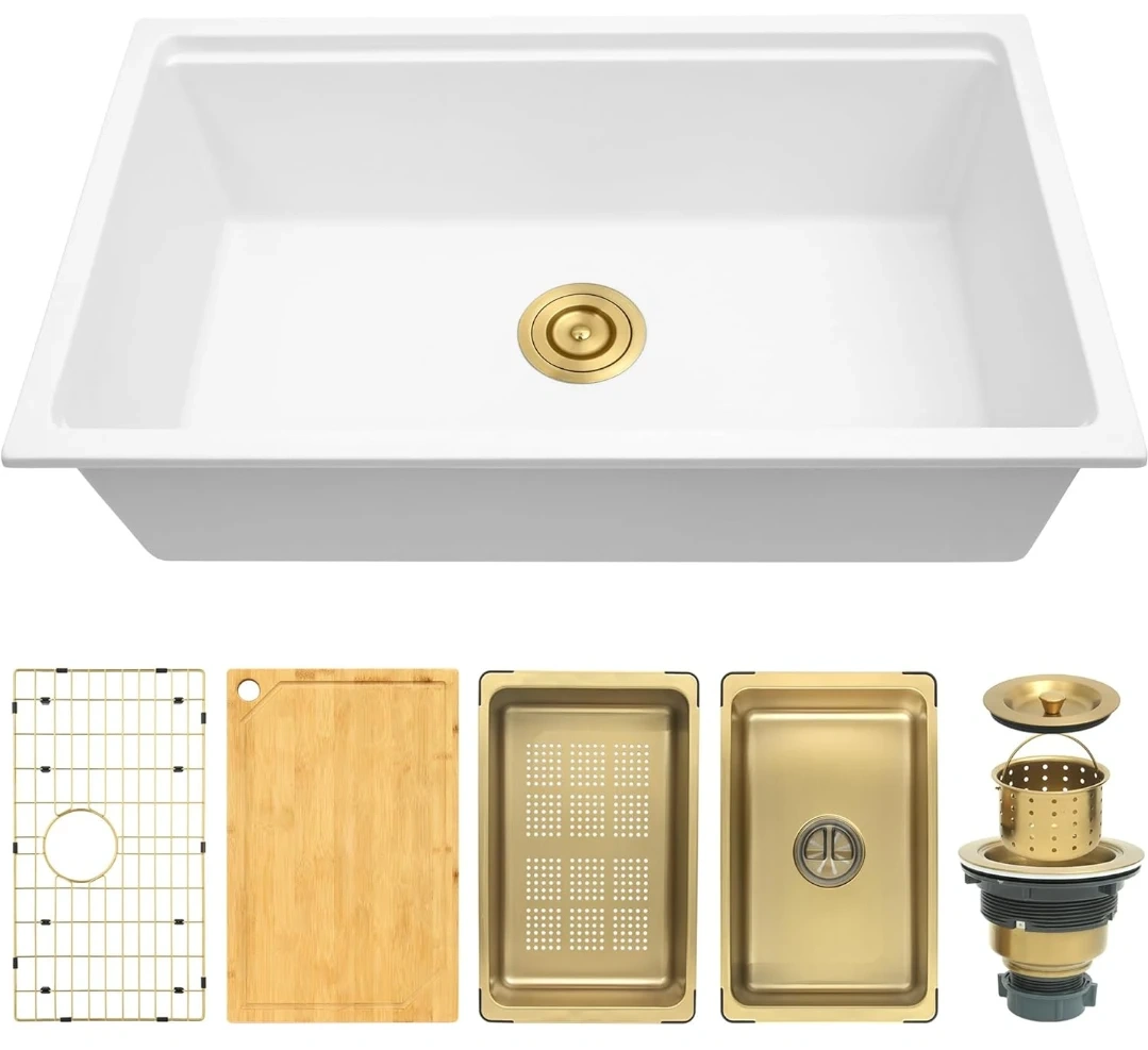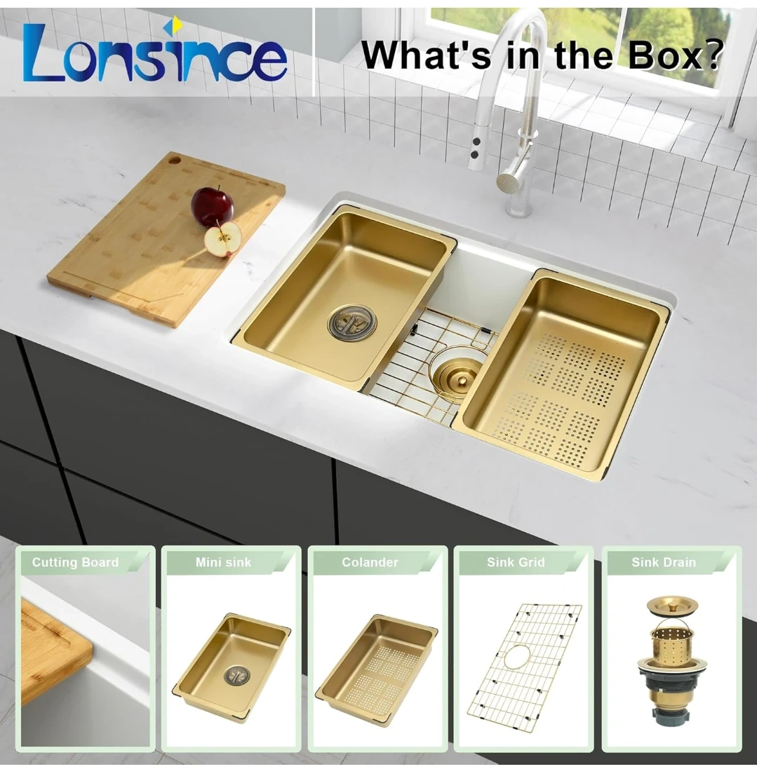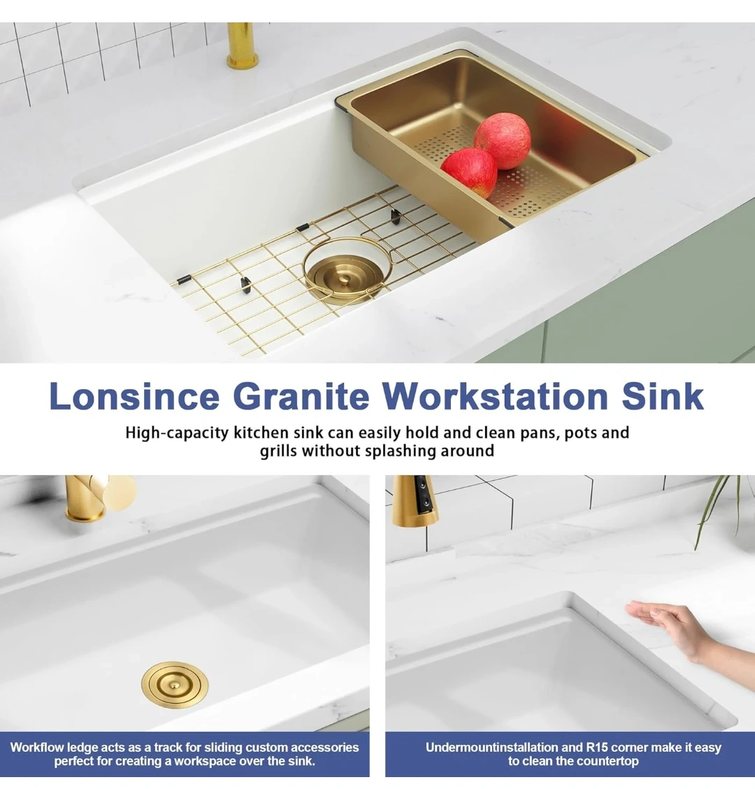 45This Lonsince granite kitchen sink is brand new. It's a high-capacity sink that makes cleaning pots, pans, and grills a breeze without splashing. The exterior bowl dimensions are 28"L x 18"W, and the interior bowl dimensions are 25 13/16"L x 15 15/16"W with a bowl depth of 9"D. It also comes with a cutting board, mini sink, colander, sink grid, and sink drain!