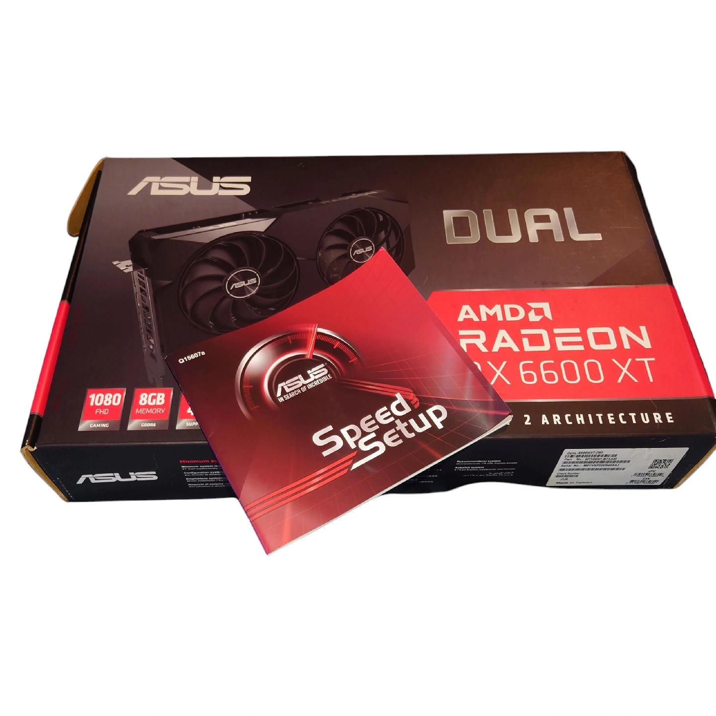​This is the ASUS Dual Radeon RX 6600 XT OC Edition graphics card ~ in excellent condition, and comes complete with the original box and manual. GPU Model: AMD Radeon RX 6600 XT / ​VRAM: 8GB GDDR6 High-speed Memory /​Architecture: AMD RDNA™ 2. Perfect for maximizing framerates at 1080p resolution, making it ideal for competitive gaming, graphics, and high-refresh-rate monitors. ASUS Dual Axial-tech Fan Design for superior cooling. The fans 0dB Technology, meaning they stop spinning entirely during light use (like browsing) for silent operation. Compact 2-slot design. Display Outputs: 1x HDMI 2.1, 3x DisplayPort 1.4a. Includes a Protective Backplate to prevent PCB flex and trace damage. Fully supports features like Hardware Ray Tracing, DirectX® 12 Ultimate, and AMD's game-changing upscaling technology, AMD FidelityFX™ Super Resolution. System Requirements: Minimum 500W power supply recommended (Please verify your system has a spare 8-pin power connector). Don't miss out on αɳ awesome card for a smooth, high-quality gaming experience!