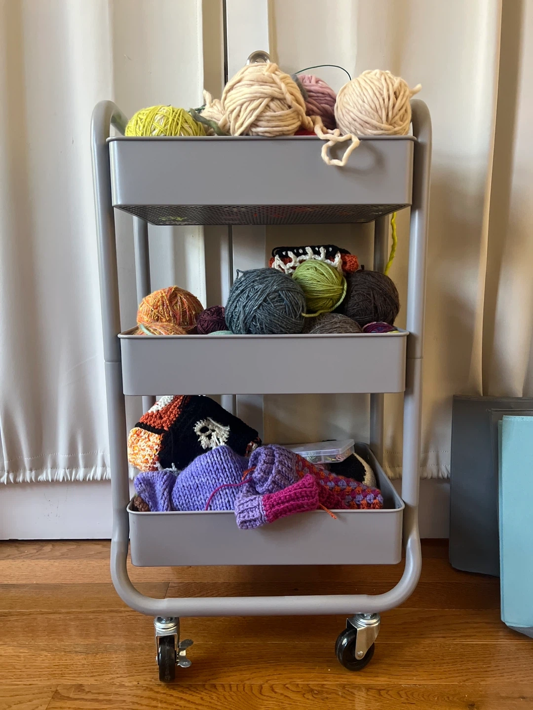 I'm selling a gray 3-tier rolling cart! It's in great shape and ready to help you organize your space. Perfect for storing craft supplies, kitchen items, bathroom storage, or anything else you need to keep tidy! (Yarn and knitted/crocheted goodies NOT included, sorry! ❤️🩹)