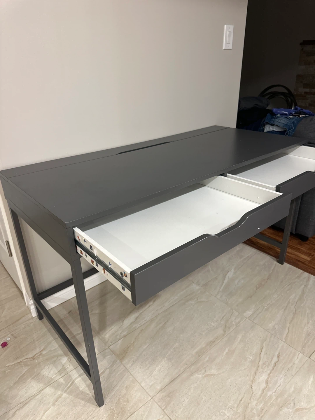 Selling a gray desk with two drawers! It's in great condition and perfect for a home office or study space. The desk has a sleek design and offers ample storage with its drawers.