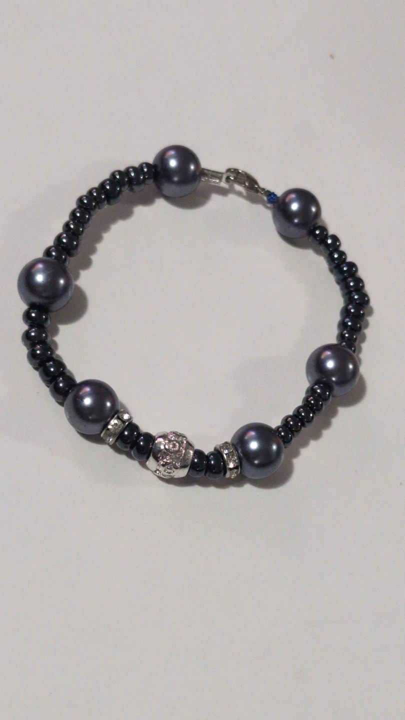 10Selling a charming black pearl beaded bracelet. It features black pearls and smaller black beads, accented with silver-tone decorative beads. A lovely addition to any jewelry collection!
